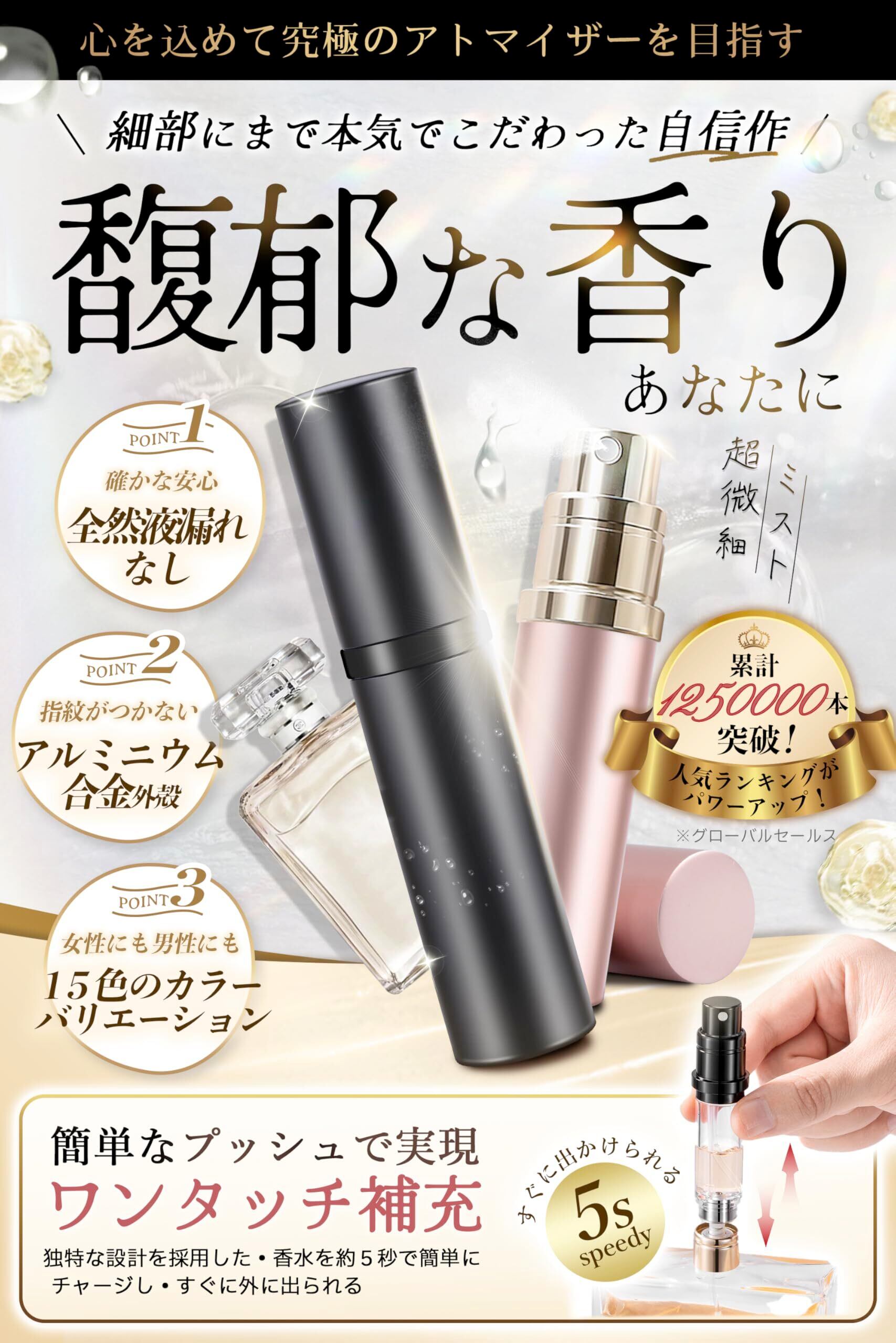 アトマイザー 【anan掲載・21カラー展開・ワンタッチ補充・持ち運び便利】 香水 アトマイザー 持ち運び 漏れない 詰め替え ボトル 5ml 底部充填 小分け ミニ 持ち歩きボトル 入れ替え 携帯 回転 香水用 容器 男女兼用 (ダークパール)