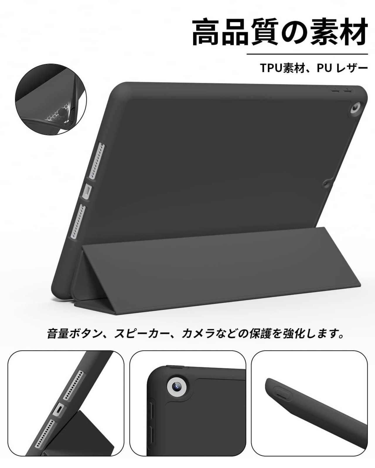 【優れる材質】スリムで軽量設計で、持ち歩きが楽々。フロントカバーはPUレザーを使ってキズに強く、バックケースは柔軟で耐衝撃性高いTPU素材を使用のため、あいぱっどを守ります。内層は、iPadの耐用年数を延ばすことができるハニカムグリッドパターンのエアクッションを提供します。