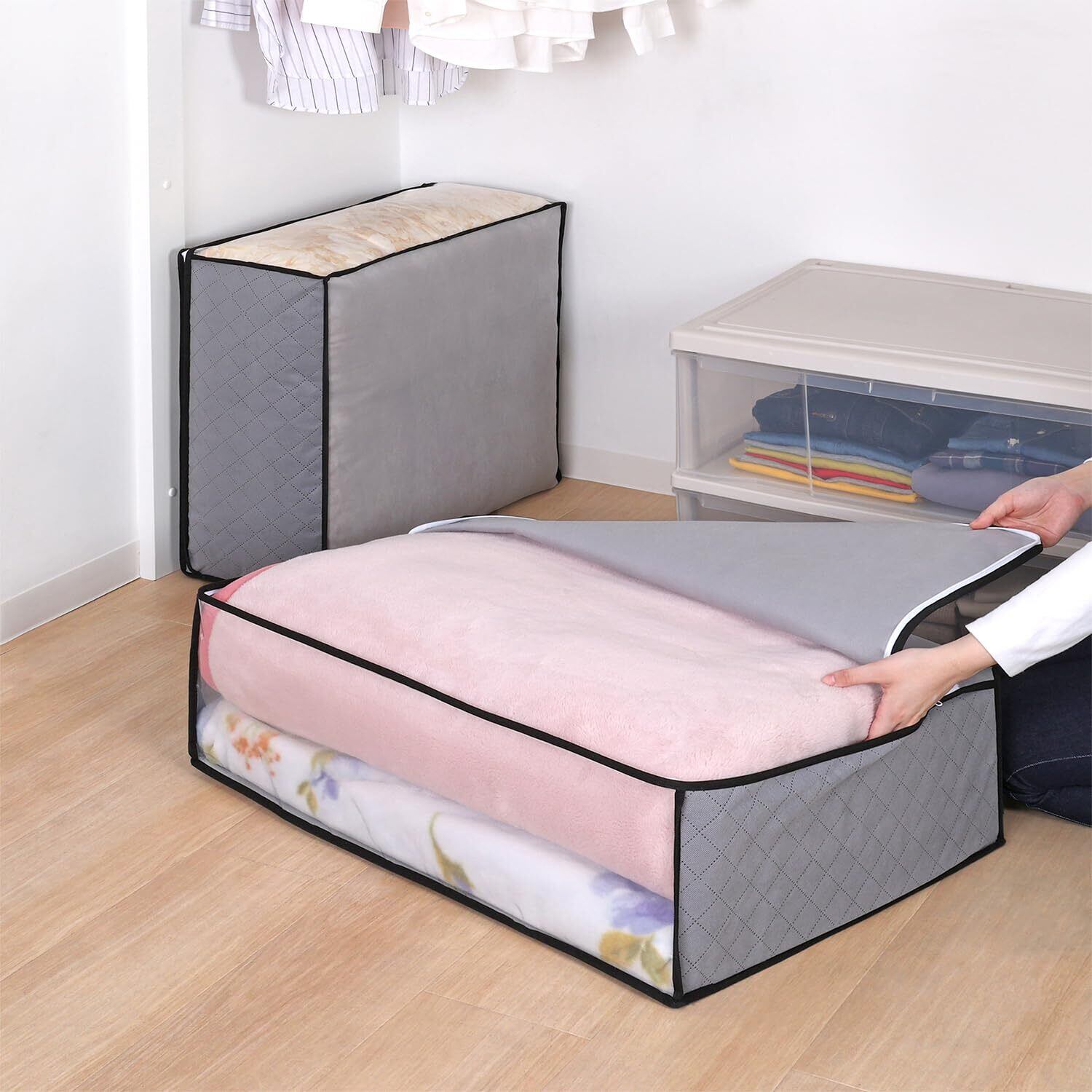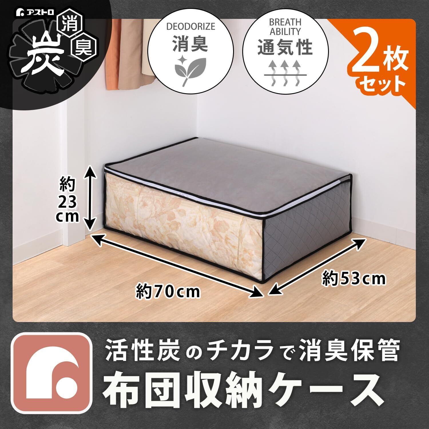 アストロ 活性炭消臭 布団収納ケース 毛布 軽寝具用 2枚組 活性炭のチカラで消臭保管 通気性の良い不織布がホコリなどの汚れをガード 3層構造の厚手でしっかりとした生地 透明窓付き 布団収納 布団袋 引っ越し グレー 171-02