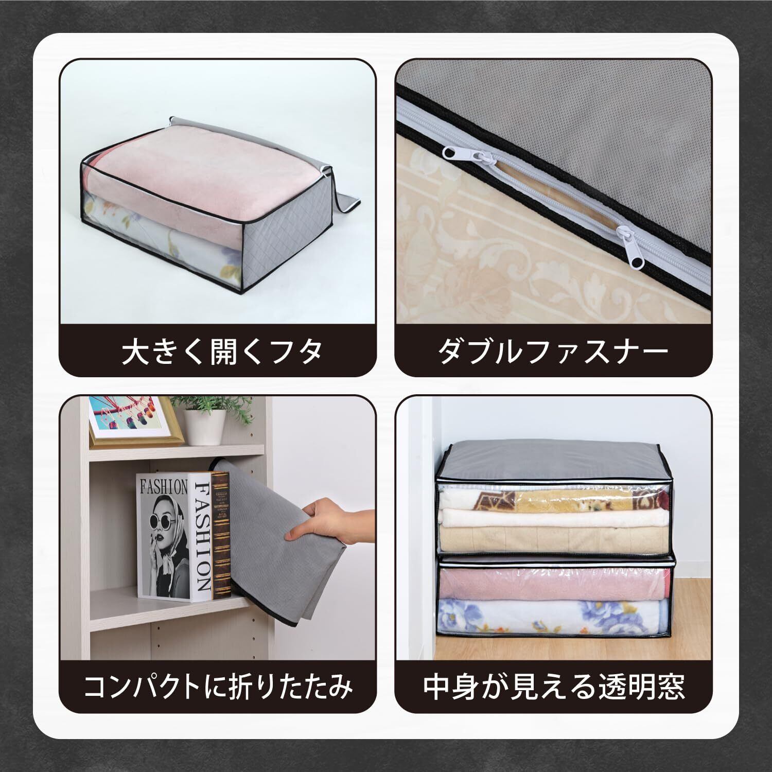 ●活性炭のチカラで消臭保管。活性炭シートがにおいをしっかり消臭。静電気が発生しやすくホコリが付着しがちな毛布や軽寝具などをにおい・ホコリ・汚れからしっかり守る。