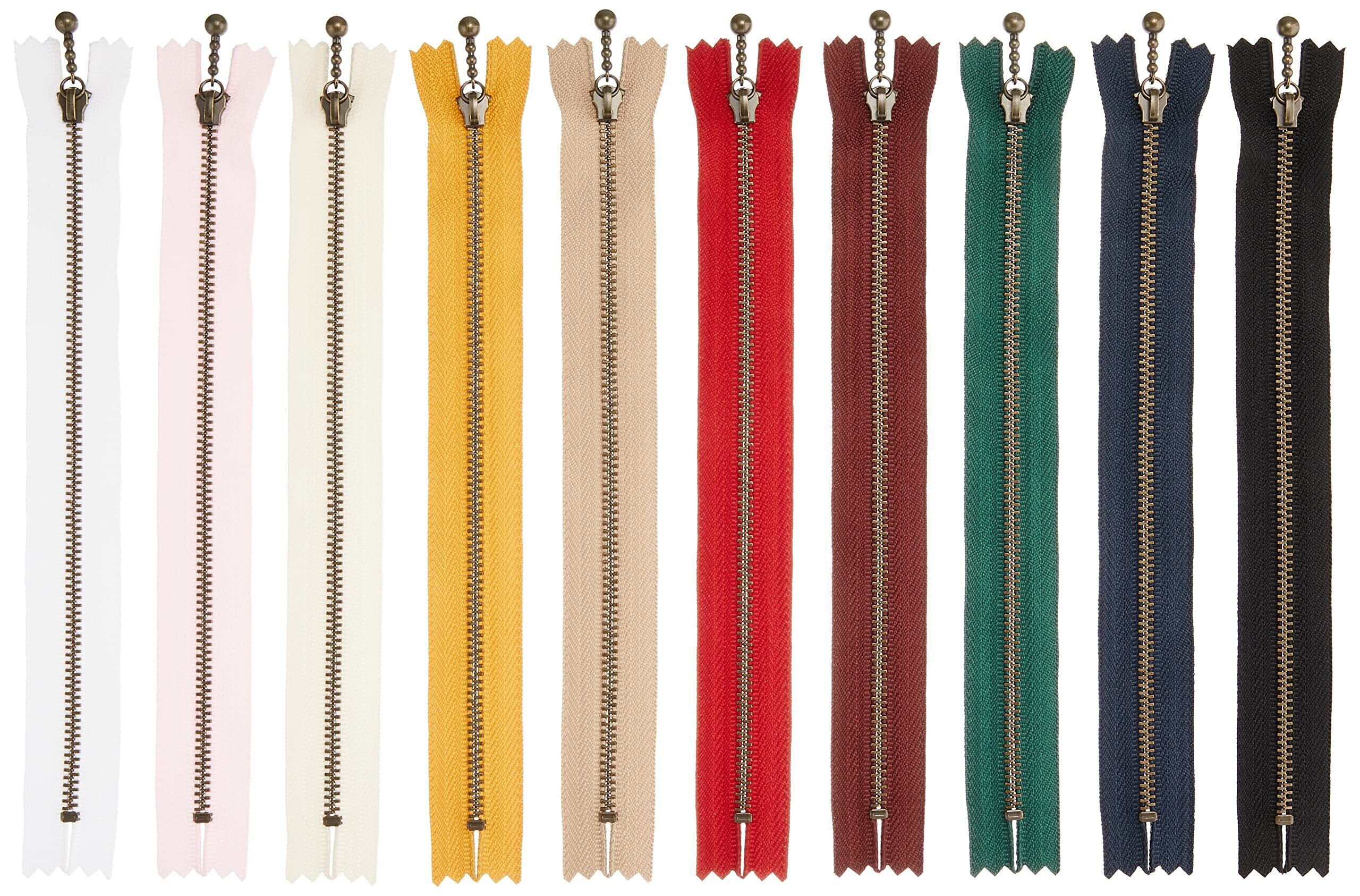 【新着商品】Y.K.K アンティークゴールド 玉付き ファスナー 止め 長さ20cm ライトカラー 10色 計10本セット 3GKB-20LS