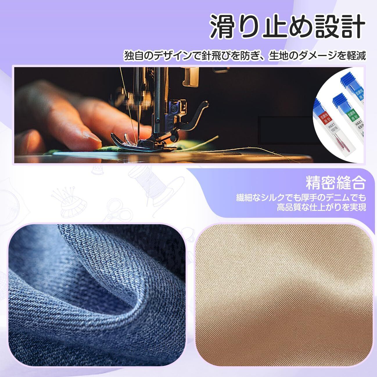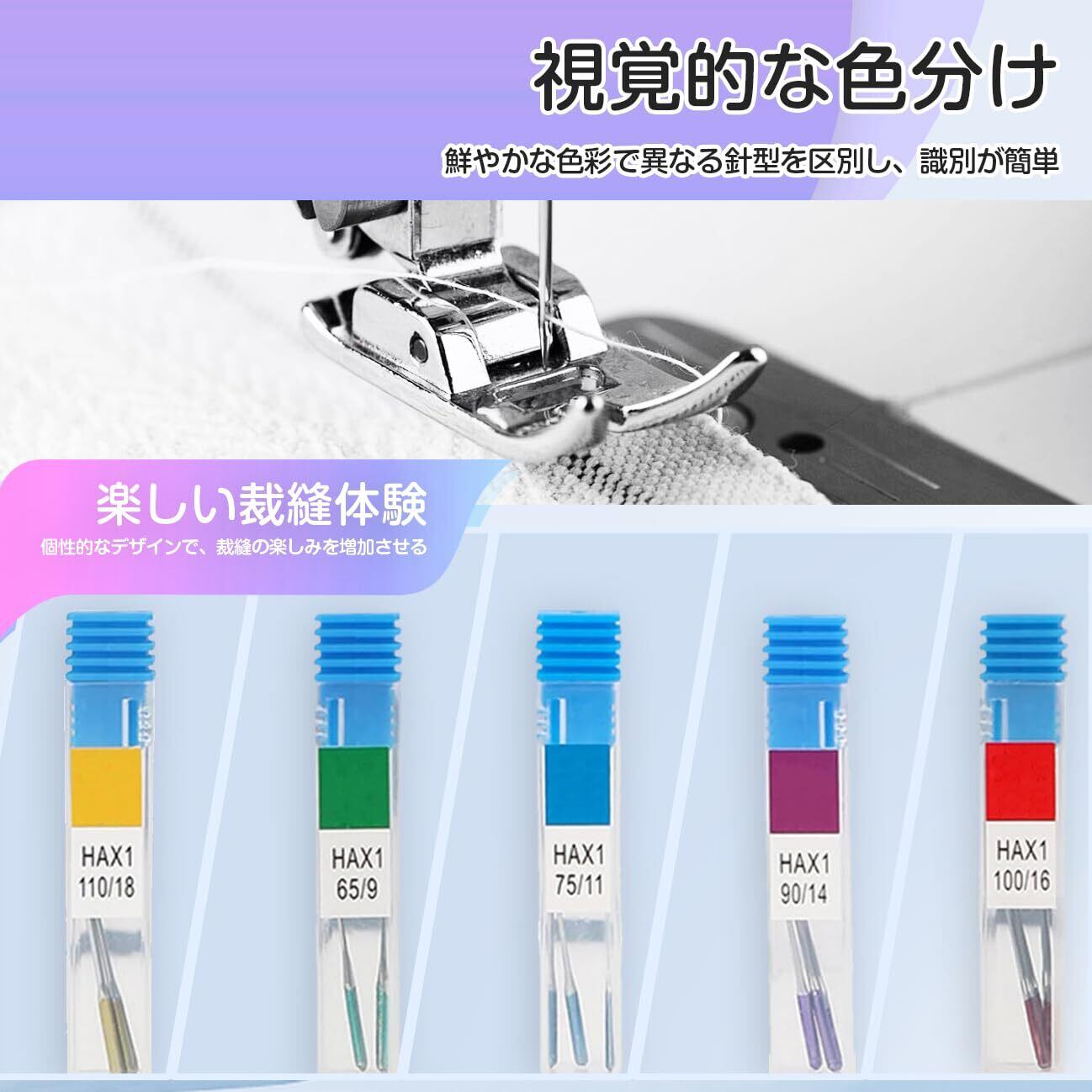 【製品シリーズの概要】 本セットには5種類の異なる型番のミシン針が集合しており、9#~ 18##の全シリーズをカバーしており、各種のミシンの需要を満たすために設計されている。各針は高級材料を用いて丹念に製造され、耐久性と精度の両立を確保し、専門の裁縫師と手作業愛好家の理想的な選択である。