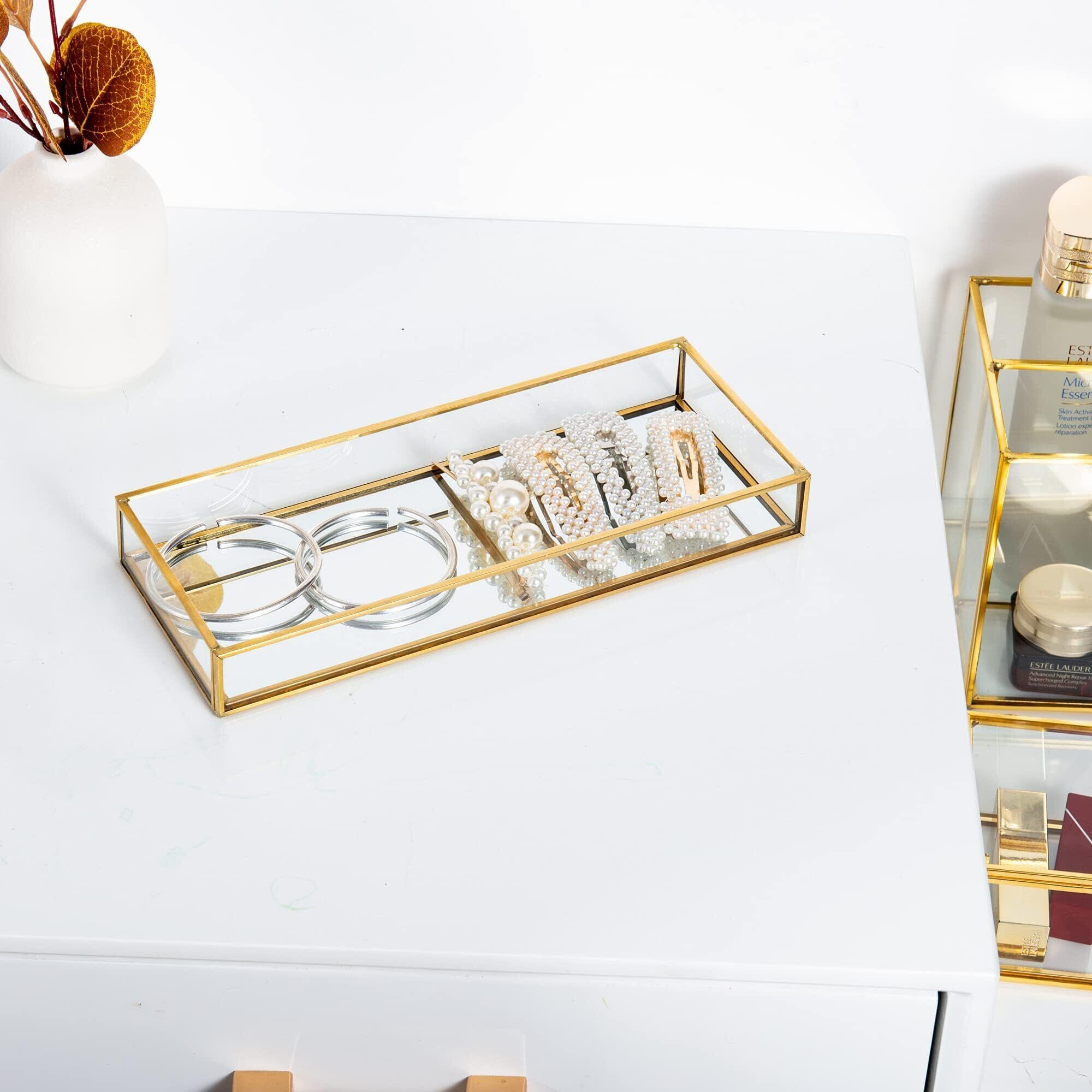 収納トレイのサイズ:25 x 10 x 3cm/20 x 10 x 3cm 重量:355g/273g カラー:ゴールド 材質:真鍮とガラス
