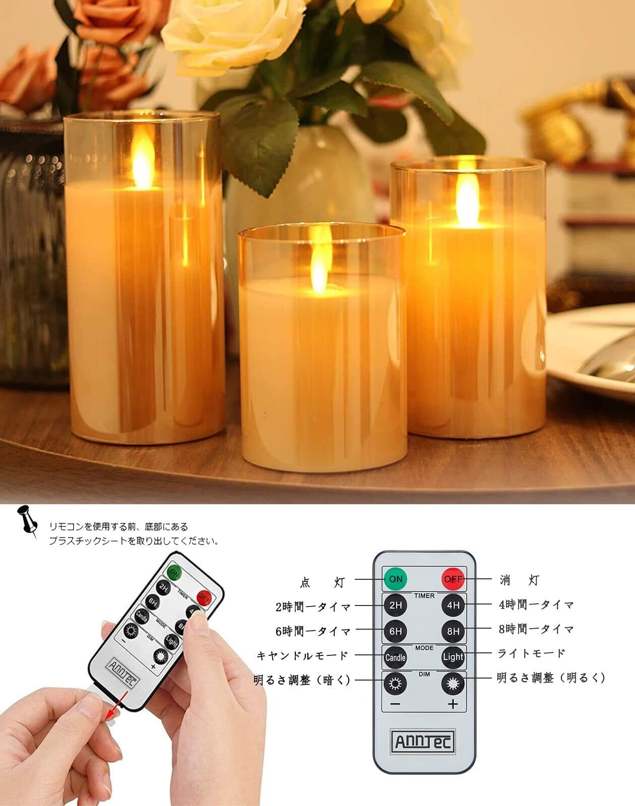 【USB充電式デザイン】1) 本LEDキャンドルはUSB充電式で、 寿命になりやすい乾電池不要です。本棚やファブリックの近くでも、心配ありません。そして、省エネで寿命が長いUSB充電式LEDライトだから、頻繁的に乾電池の交換が不要で、長くご使用いただけます。2) IRリモコン(CR2025電池を含む)を使って、タイマー機能などのキャンドルをコントロールできます。タイマーモード:2時間/4時間/6時間/8時間の自動消灯タイマー設定可, 1つのリモコンで距離が6M未満であれば、すべてのキャンドルをコントロールできます。3)充電時間:1時間、使用時間:20時間。