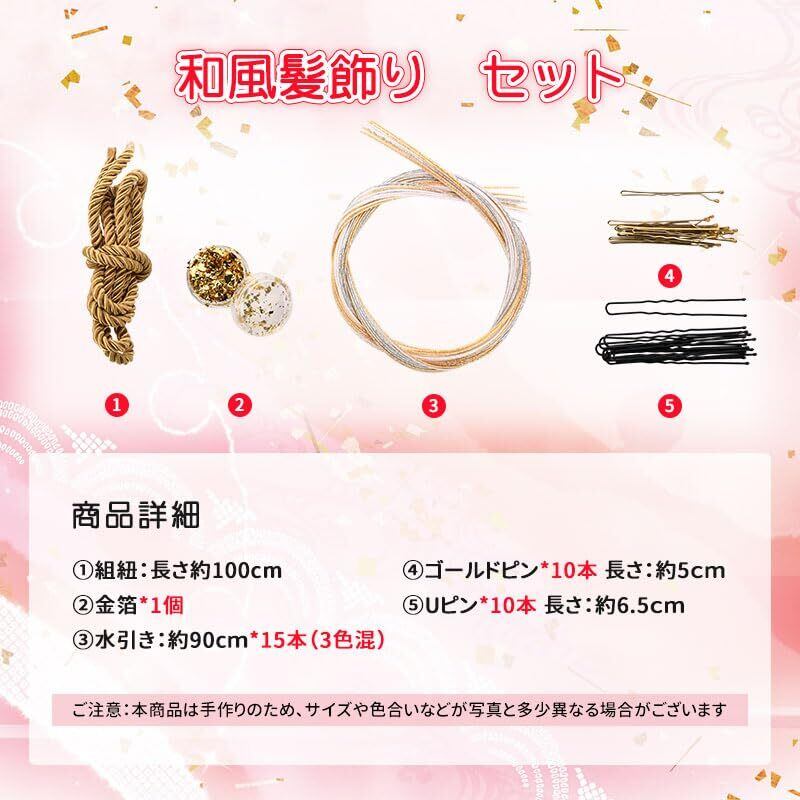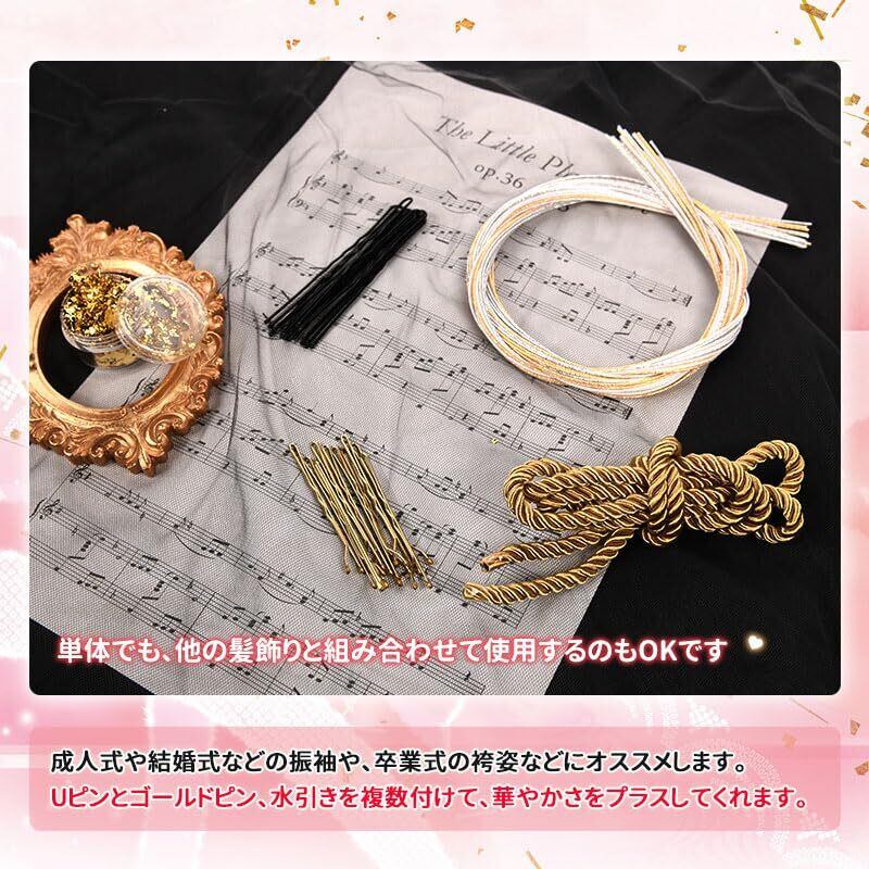 和装髪飾りヘアアクセサリーセット内容:金箔:1点 水引:約90cm*15本 Uピン:10本 ピン:10本 組紐:長さ約100cm 単体でも、他の髪飾りと組み合わせて使用するのもOKです。