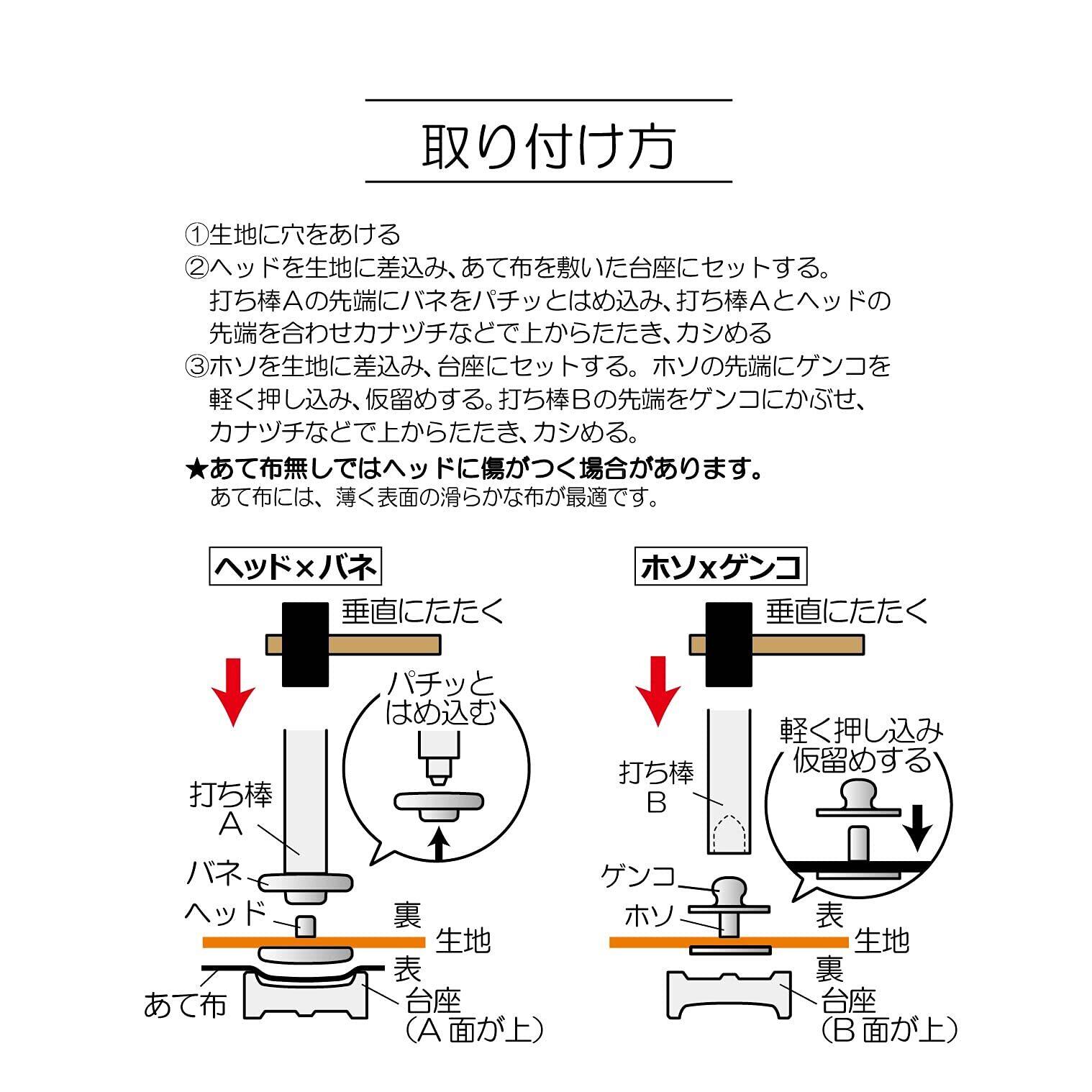 着脱の軽いスナップ、バネホックです。(打ち具付き)