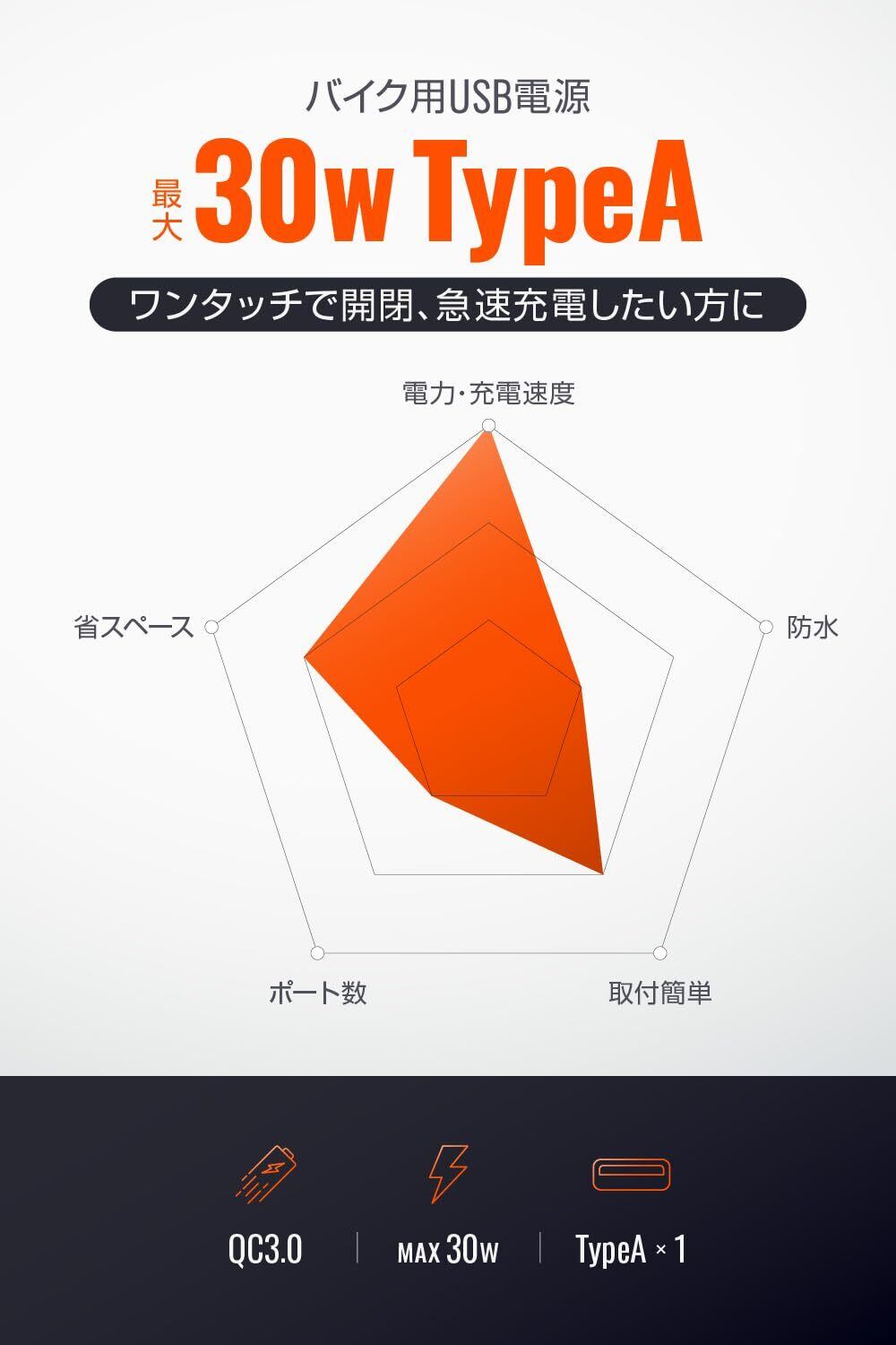 USB Type-A QC3.0対応、最大30Wまでの急速充電が可能なUSB電源。