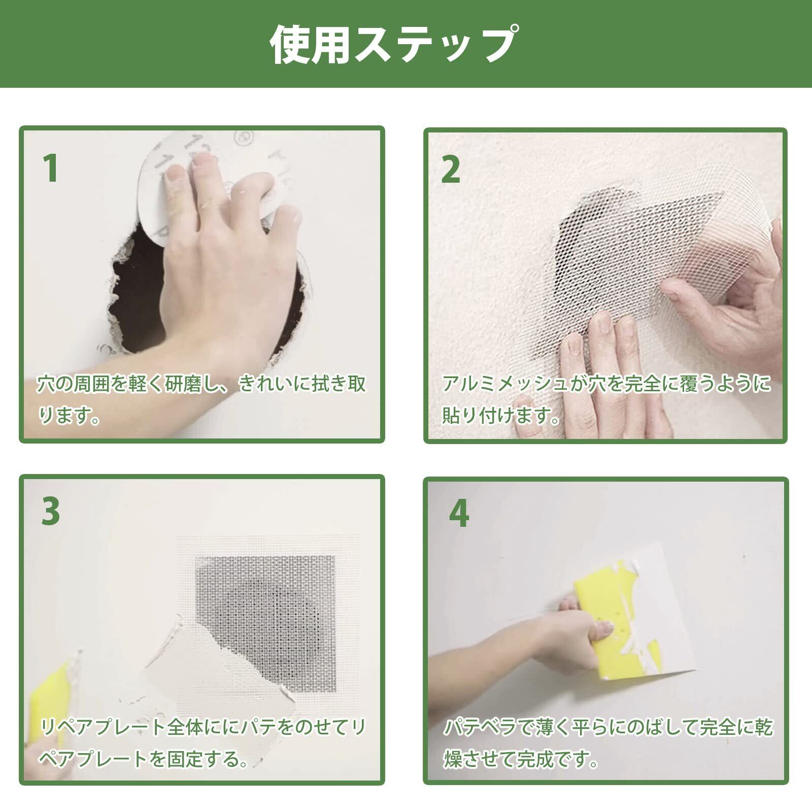 【使用ステップ】1.穴の周囲を軽く研磨し、きれいに拭き取ります。2.リペアプレートの剥離紙をはがし、リペアプレートの粘着面を壁側にして、アルミメッシュが穴を完全に覆うように貼り付けます。3.リペアプレート全体ににパテをのせてリペアプレートを固定する。4.パテベラで薄く平らにのばして完全に乾燥させて完成です。