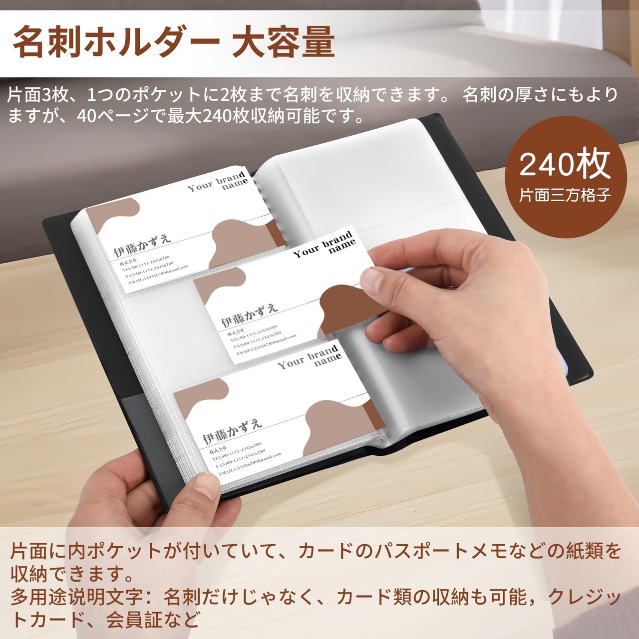 抜群の大容量,これは名刺ホルダー 大容量,240枚の名刺が収納可能:名刺入れは片面3ポケット、計40ページなので、各ポケットに名刺を2枚ずつ入れれば、(カードの厚さにより異なります)、最大240枚の名刺を収納できる。 大量の名刺を一元管理できる。また.表紙左内側にはクリア収納ポケットもあり、パスポー ト切符やレシートなど の小物を収納できる