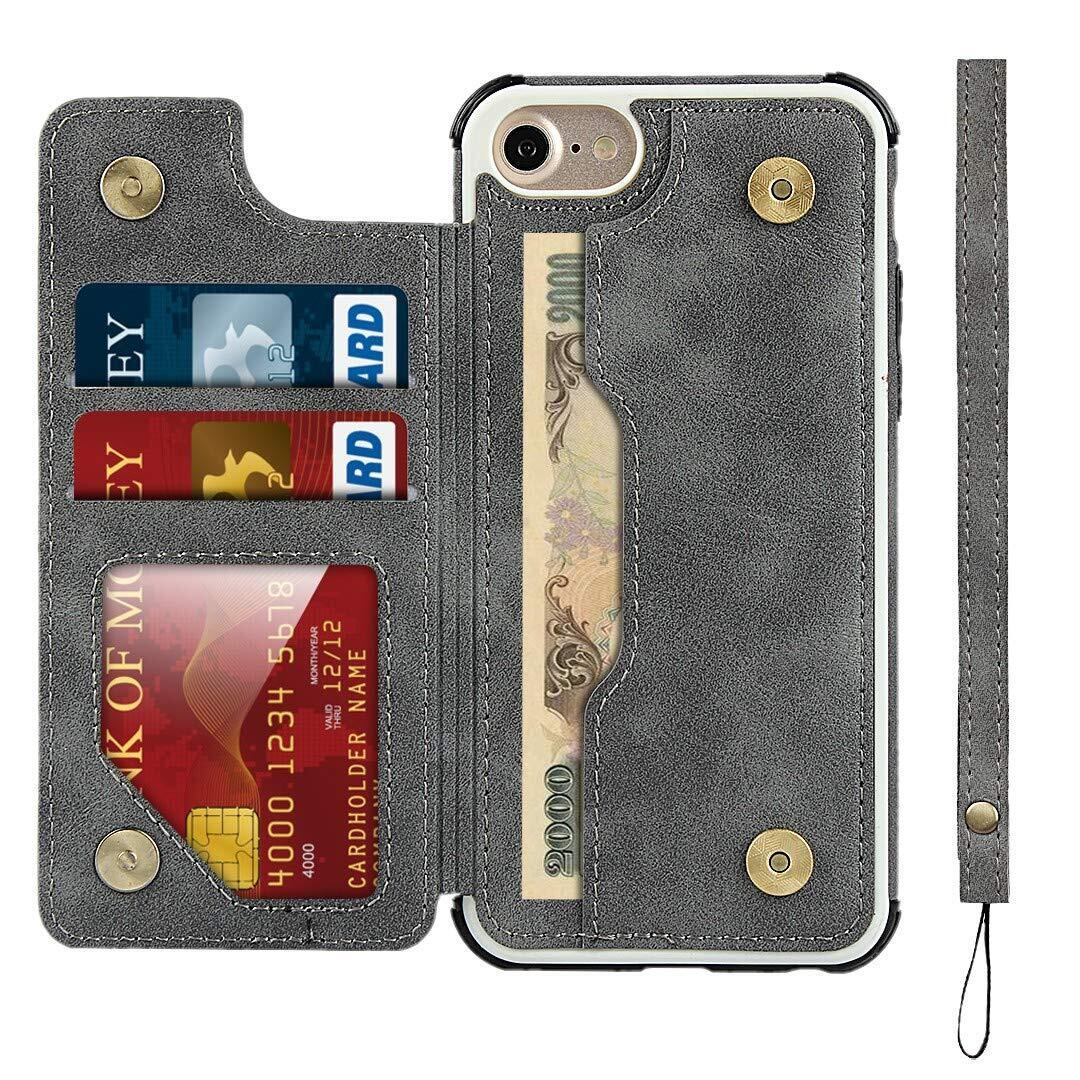 Pelanty iPhone SE 第3世代 2022 ケース iPhone SE 第2世代 2020 ケース iPhone 7 iPhone 8 ケース 縄掛け アイフォン6/ iPhone 6s ケース 4.7インチ 通用 背面 手帳型 PUレザーケース IC カード収納 スタンド機能 ボタン磁気 多機能 携帯カバー 軽量 耐衝撃 滑ストラップ スマホケース 全面保護 グレー
