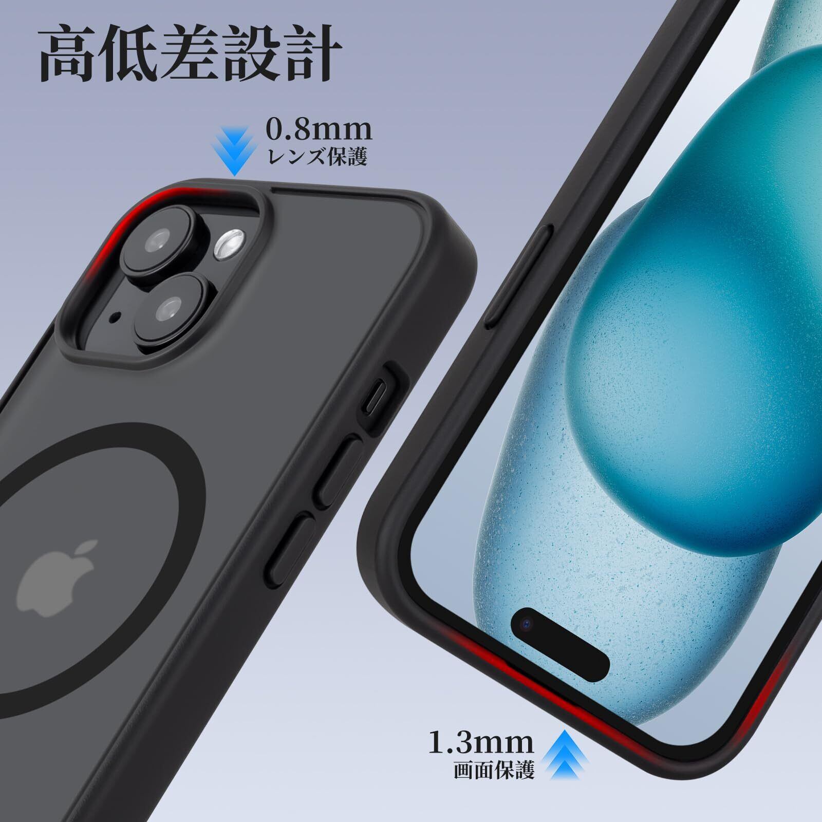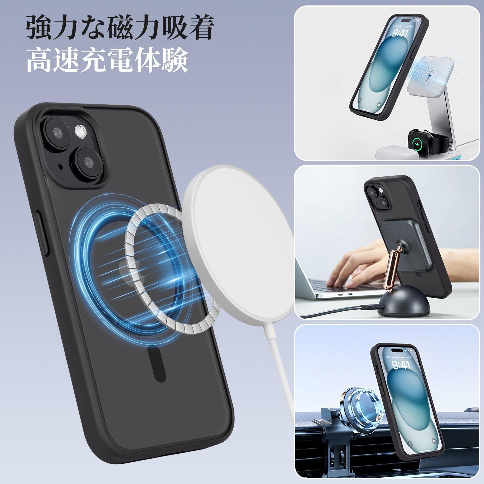 【特価商品】iPhone 15 用 ケース Magsafe対応 iPhone 15 ケース 耐衝撃 マット 滑り止め 指紋防止 米軍MIL規格 黄変防止 耐久性 ワイヤレス充電対応 半透明 マグネット搭載アイホン15 携帯ケース 6.1 インチ (ブラック)