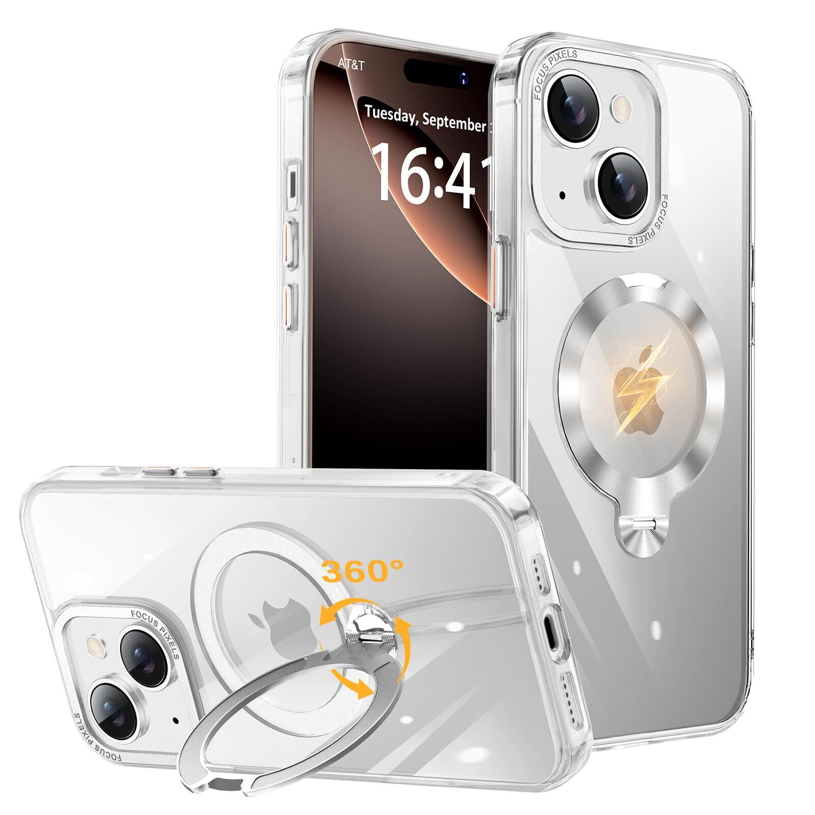 TISTUNST iPhone 15 用 ケース 透明 CDリング 【多機能 360°回転スタンド】【横縦両立・角度自由調整】搭載MagSafe対応 ワイヤレス充電対応 米軍MIL規格 耐衝撃 防指紋 黄変防止 レンズ保護 両眼 いphone15 用 ケース 6.1インチ (シルバー)