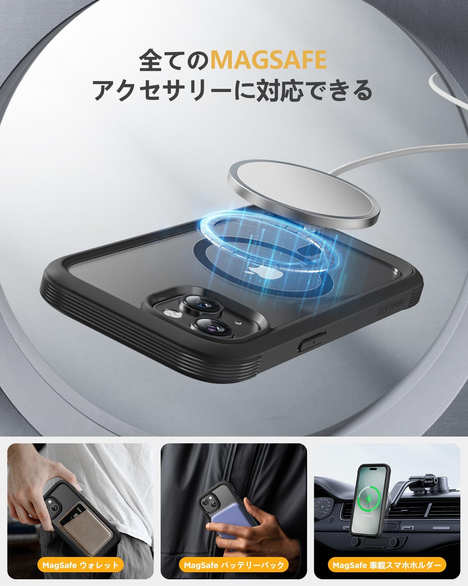 Miracase iPhone15 用 ケース MagSafe対応 9H 強化ガラス 360°保護 スマホケース iPhone15 用 カバー 全身バンパー保護ケース 6.1インチ フルカバー ワイヤレス充電対応 マグセーフ対応 マグネット搭載 黒