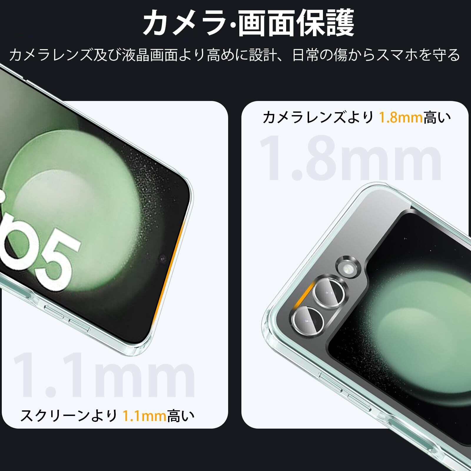 【液晶画面・カメラレンズ保護】カバーの縁はギャラクシー Z Flip5の液晶画面より1.1mm高く、カメラレンズより1.8mm高い、併用の全面保護ガラスフィルムで平置きしても画面は接触しない、細部までの保護も配慮され、より一層な安心感を与えられる。また、カメラのレンズやボタンの保護だけでなく、汚れや指紋や傷なども付きにくいです。