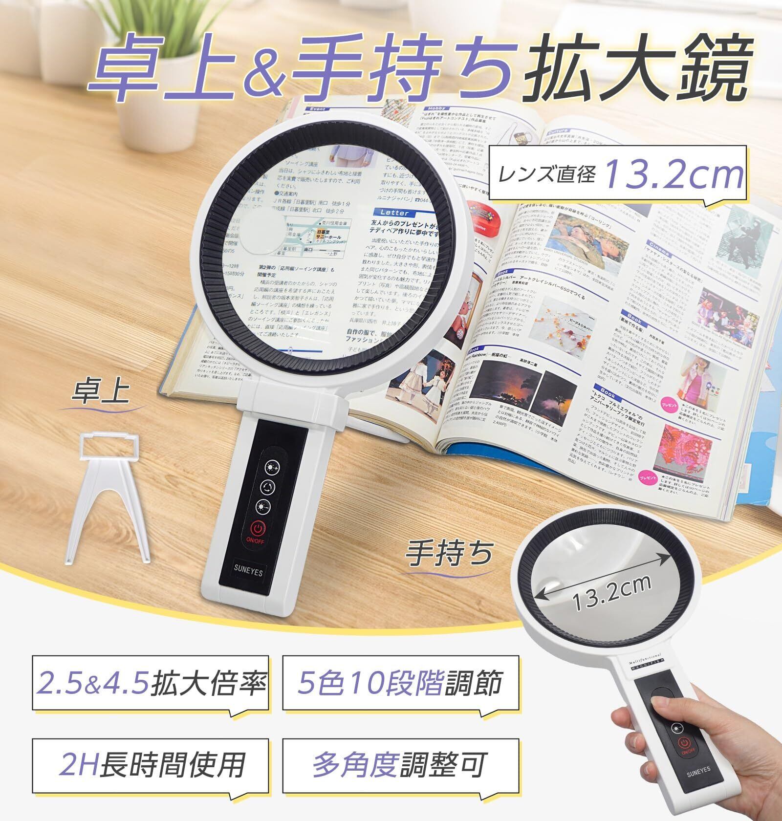 SUNEYES 拡大鏡 スタンド 卓上 ルーペ 手持ち 2.5倍&4.5倍 レンズ径13.2cm TypeC充電式 34個LEDライト 3種色温度 10段階調光 スタンドルーペ 虫眼鏡 高倍率 読書 作業 観察 手持ち 卓上 2WAY 拡大鏡 日本語説明書 NS031