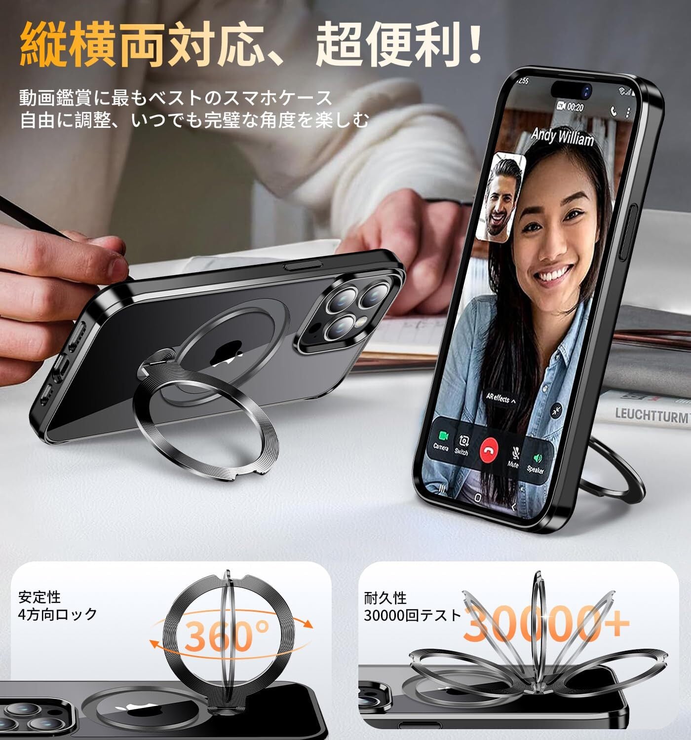 【本当の進化・360°定点回転神スタンド】このiPhone 14 Pro Maxケースは革新的な360度定点回転スタンドを採用し、縦置き・横置きどちらでも0°から170°まで自由に調整できます。iPhone 14 Pro Max専用設計で、ビデオ通話や映画鑑賞時に両手を完全に解放し、快適な使い心地を存分に与えます。このアイホン14プロマックスケースのヒンジは強化航空材料を使用して改良されており、耐久性と安定性に優れ、リングの緩みや破損のリスクを完全に解消しました。30,000回の耐久テストをクリアし、耐久性は通常製品より80%に向上!さらに、全隠し式スタンドデザインで、使用しない時は水平に収納でき、スペースを節約して携帯に便利です。また、スマホリングとしても使用でき、片手で簡単に操作できます。このいphone14プロマックスケースは機能性とファッション性を両立させ、あなたのライフスタイルをより豊かにします!