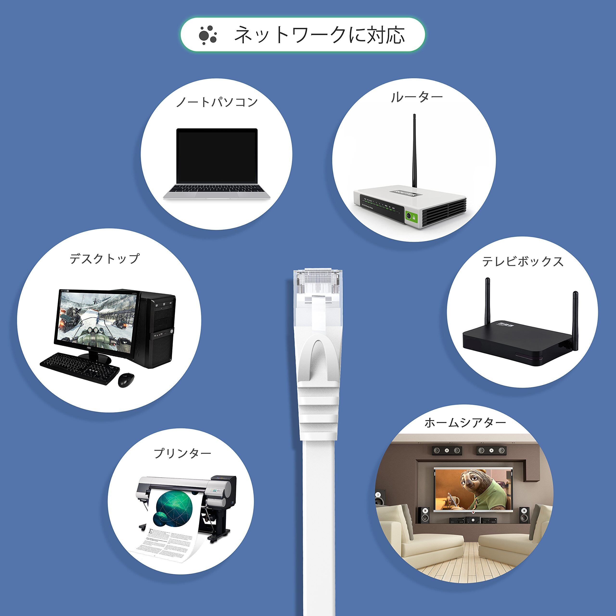 【高速・安定通信】Cat6 フラットLANケーブル、CAT6規格準拠、内蔵100%銅線、4対8芯シールドケーブル、マルチストランド無酸素銅、最小限のノイズ、および少ない干渉をします。最大伝送速度は1000Mbps(1Gbps)であり、250 MHzの伝送帯域を提供し、ギガビット完全対応LANケーブルです。