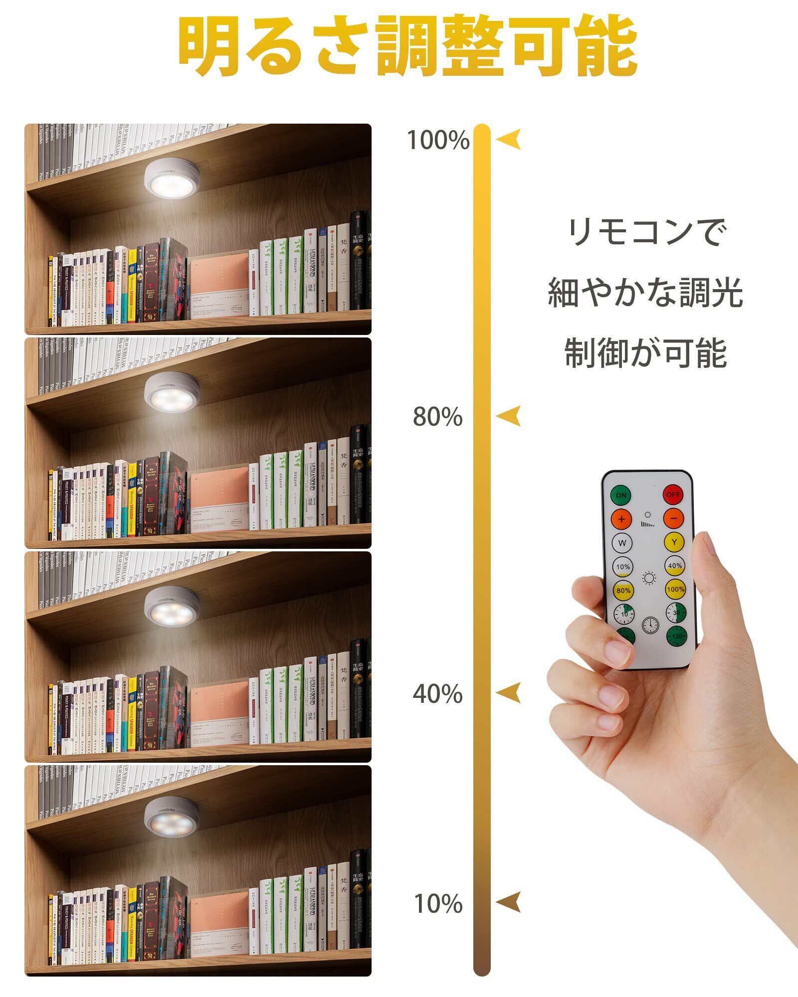 【明るさ調整可能】 この電池式LEDライトはリモコンで10%・40%・80%・100%の明るさに細やかな調光ができます。LEDライトが眩しすぎる!というのは意外とよくある困りごとです。そんな場合はリモコンで最適な明るさに調整でき、目に負担をかけずに利用できます。そこで、玄関の照明、キッチンの補助照明とワードローブ照明などにもおすすめです。