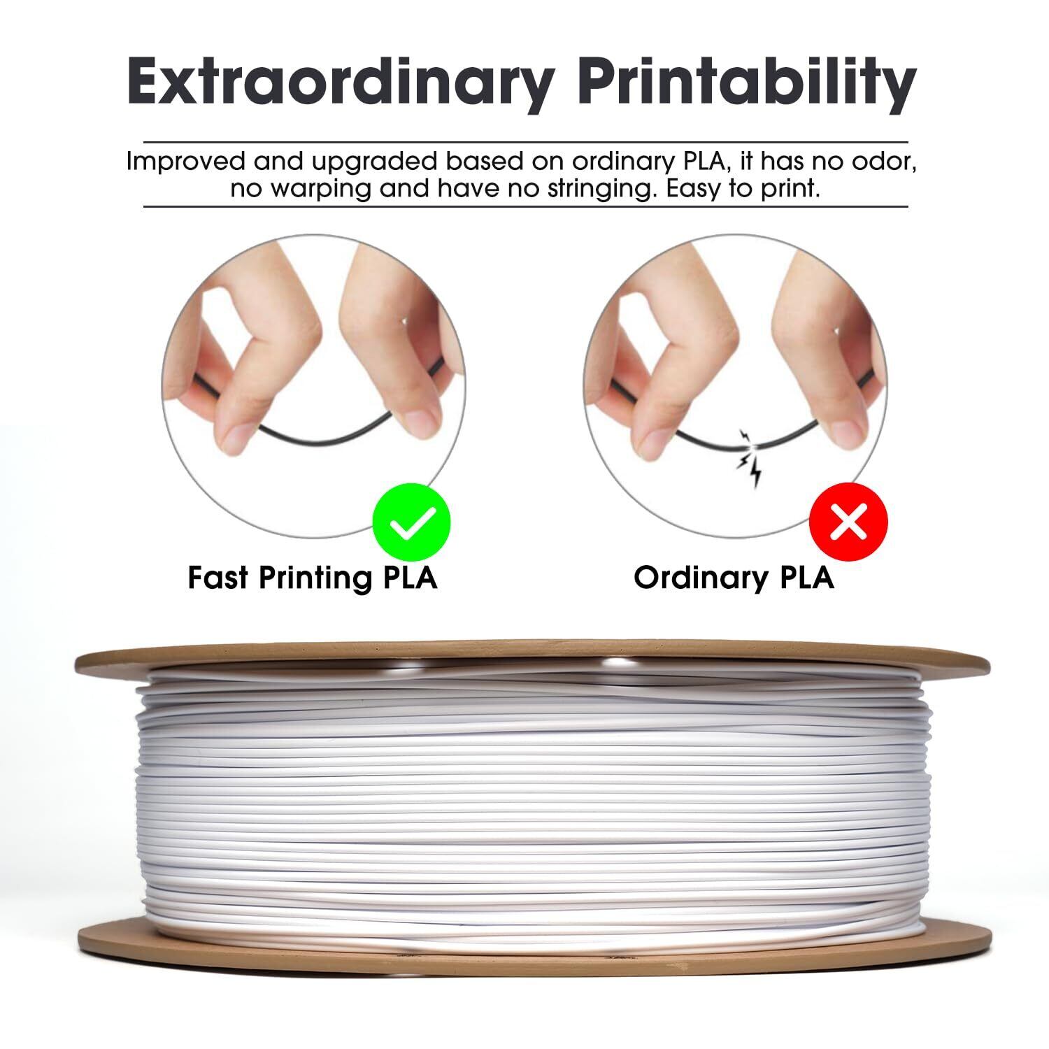 【簡単に印刷できる】:通常のPLAフィラメントと比較して、eSUN ePLAはより高い精度を持ち、ワーピングが少なく、もろさが少なく、簡単に折れにくい特徴があります。また、溶けやすく、ノズルやエクストルーダーの詰まりなくスムーズにフィードされるため、高い印刷成功率と良好な成形効果がされます。