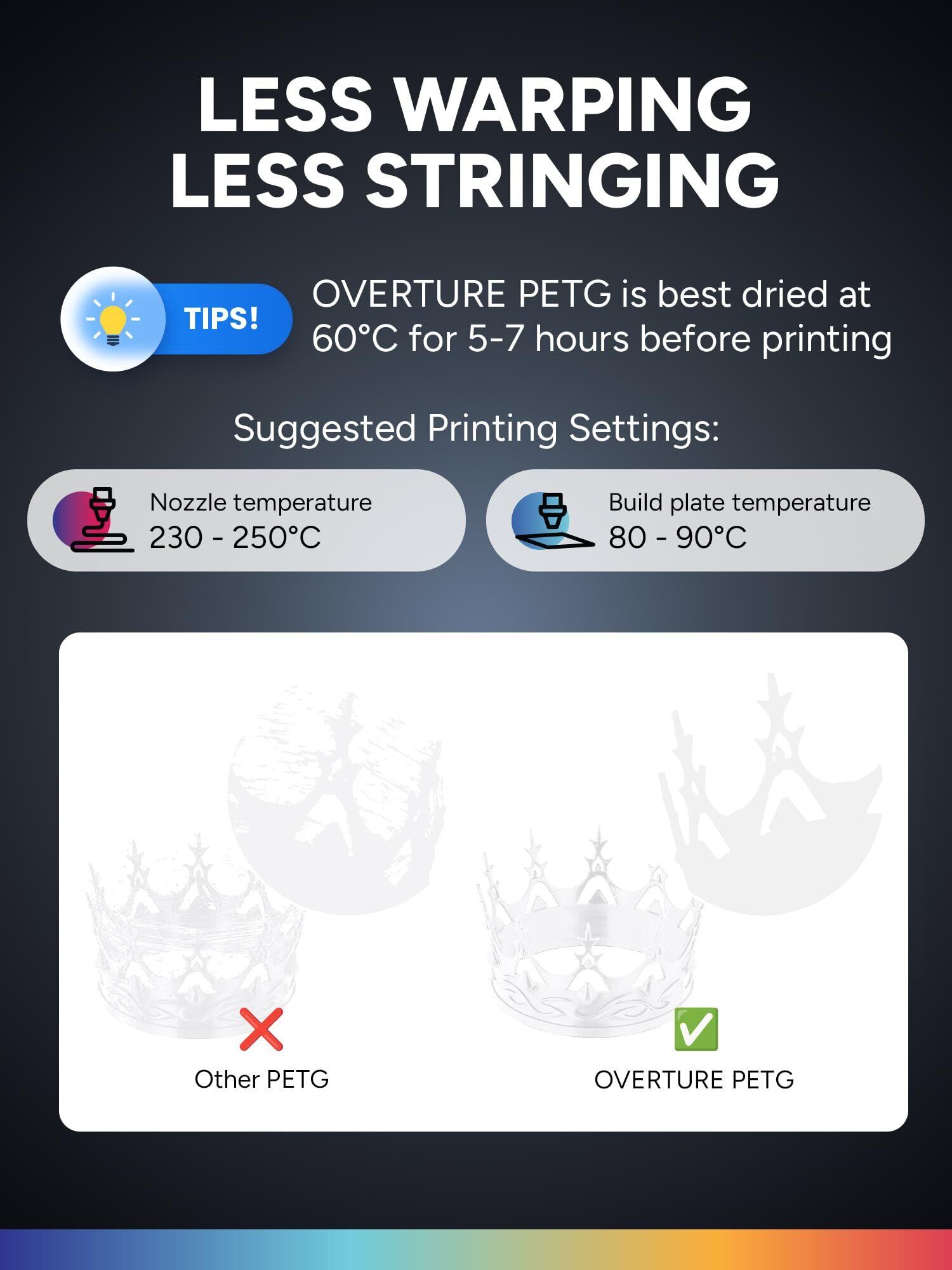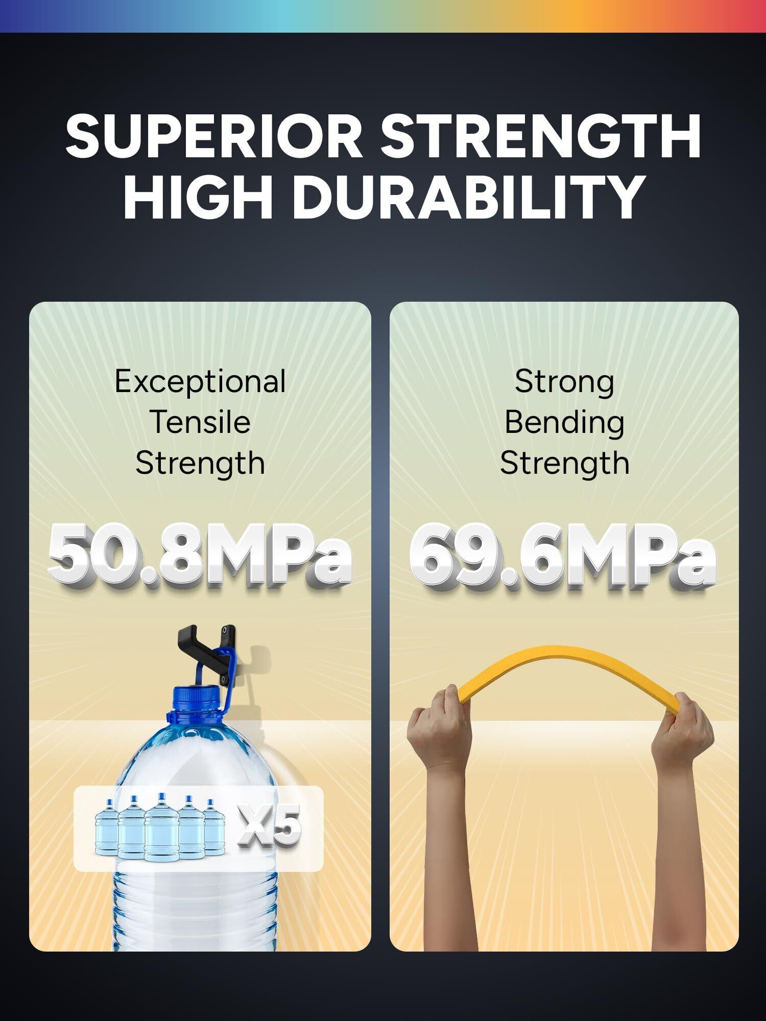 【高性能&互換性】 Overture PETGは、PLAとABSの両方の利点を組み合わせ、PLAの印刷の簡便さとABSの機械的特性の向上、特に強化された衝撃耐性と優れた層間粘着性を備えています。