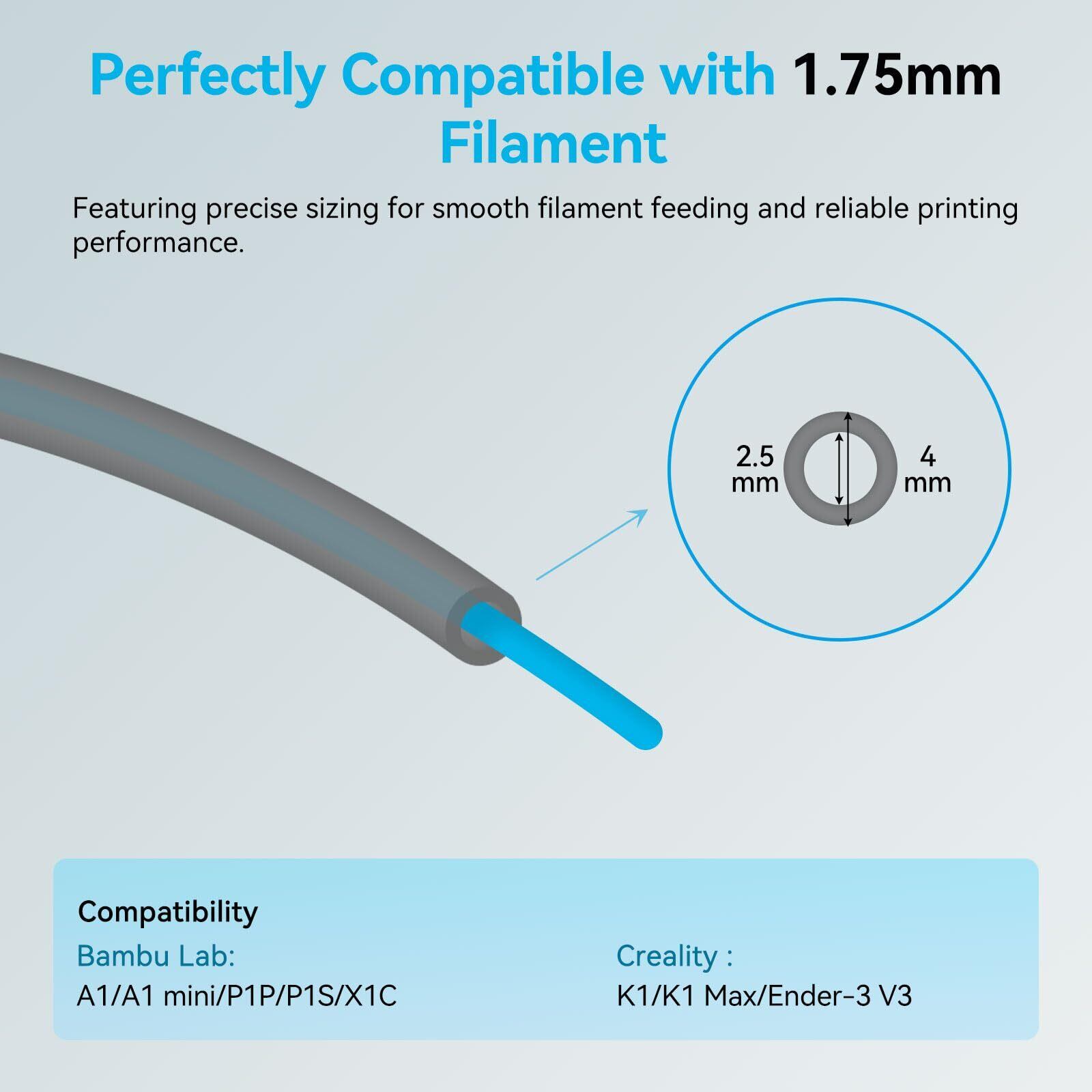 【互換性】この2メートルのPTFEテフロンチューブは、Bambu Lab A1、A1 Mini、P1P、P1S、X1Cなどのダイレクトドライブ押出機や、Creality K1、K1 Max、Ender-3 V3と互換性があります。 正確な寸法により、フィラメントの供給がスムーズになり、一貫した印刷結果が得られます。