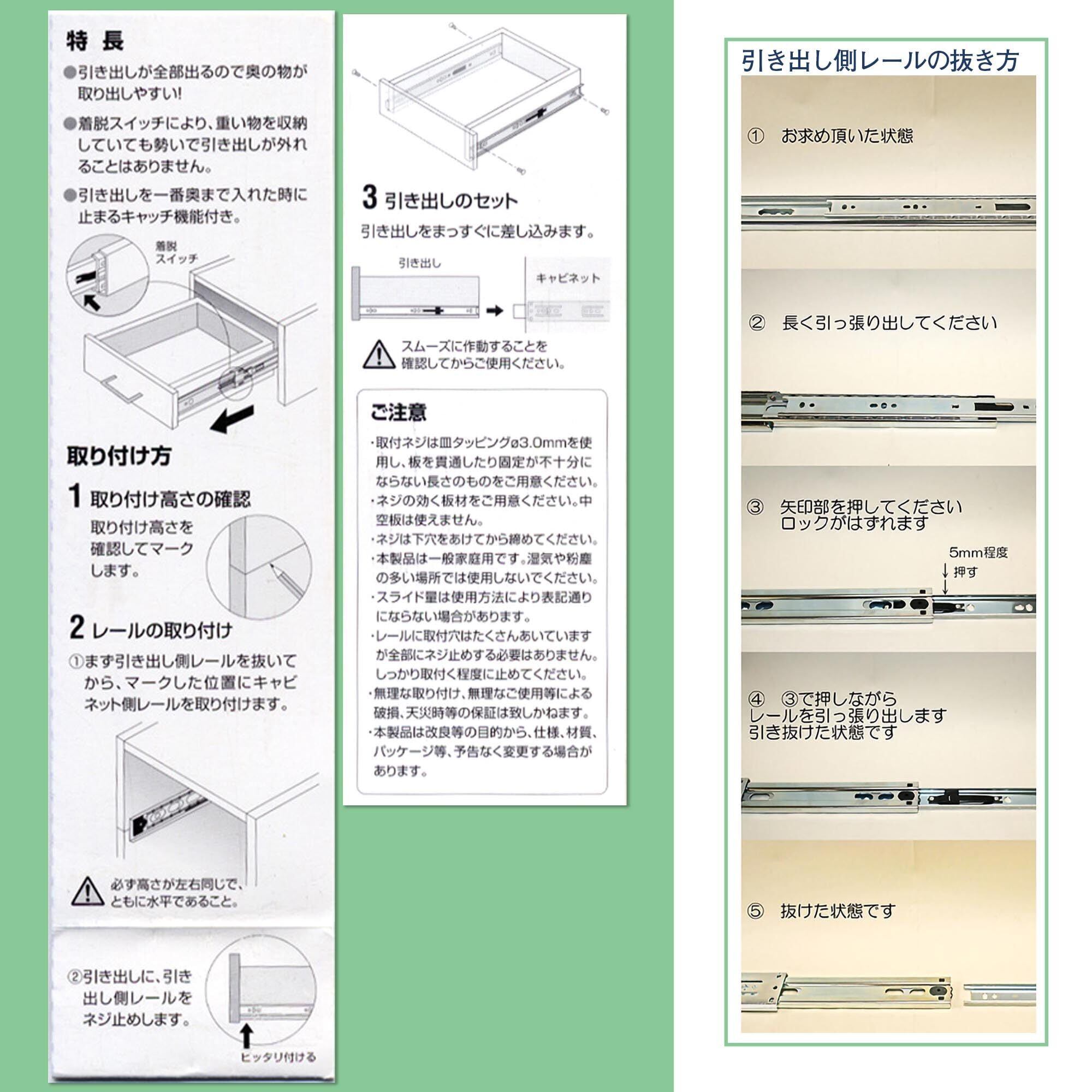 注意:引き出しの長さと同じ長さのレールを選んでください。