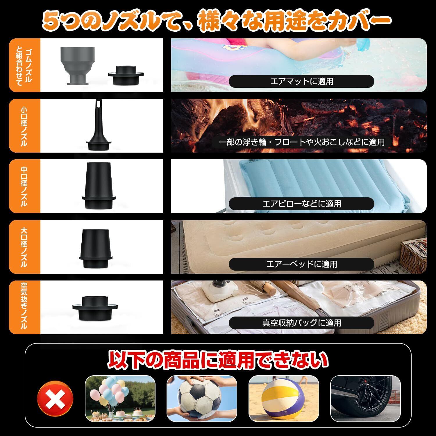 【多用途に適した5つのノズル】5種類のアタッチメントが付属しており、キャンプ用のインフレーターマットやエアークッションの充気はもとより、BBQの火起こし送風、夏の浮き輪の膨らましなど、幅広い用途で大活躍。シリコン製のアタッチメントは伸縮性が高く、サイズに多少の誤差があっても問題なく使用できます。その際は、手で押さえながらご使用ください。