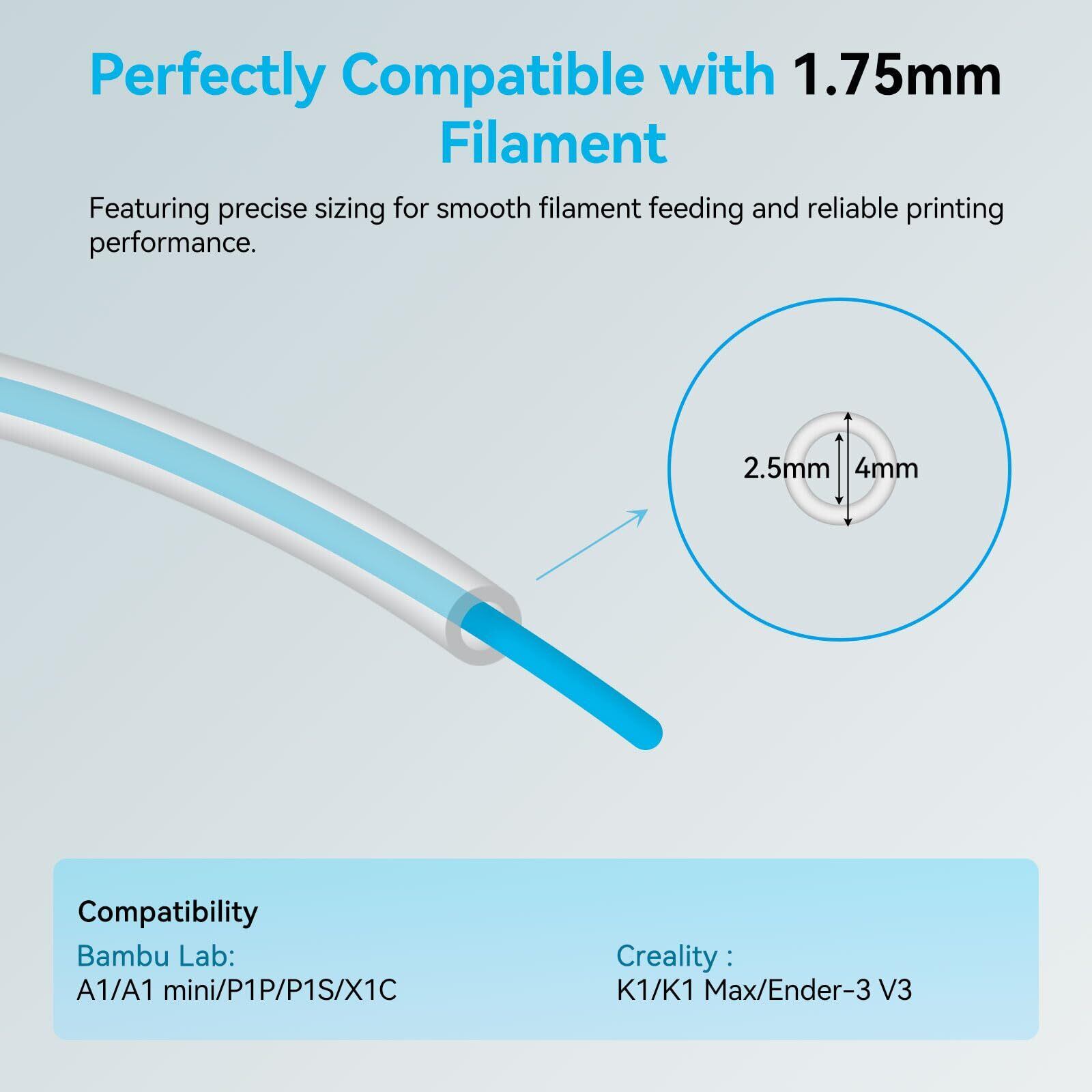 【互換性】この1.75mmフィラメント用PTFEチューブは、Bambu Lab A1/A1 mini/P1P/P1S/X1CやCreality K1/K1 Max/Ender 3 V3などのダイレクトドライブ押出機と互換性があります。
