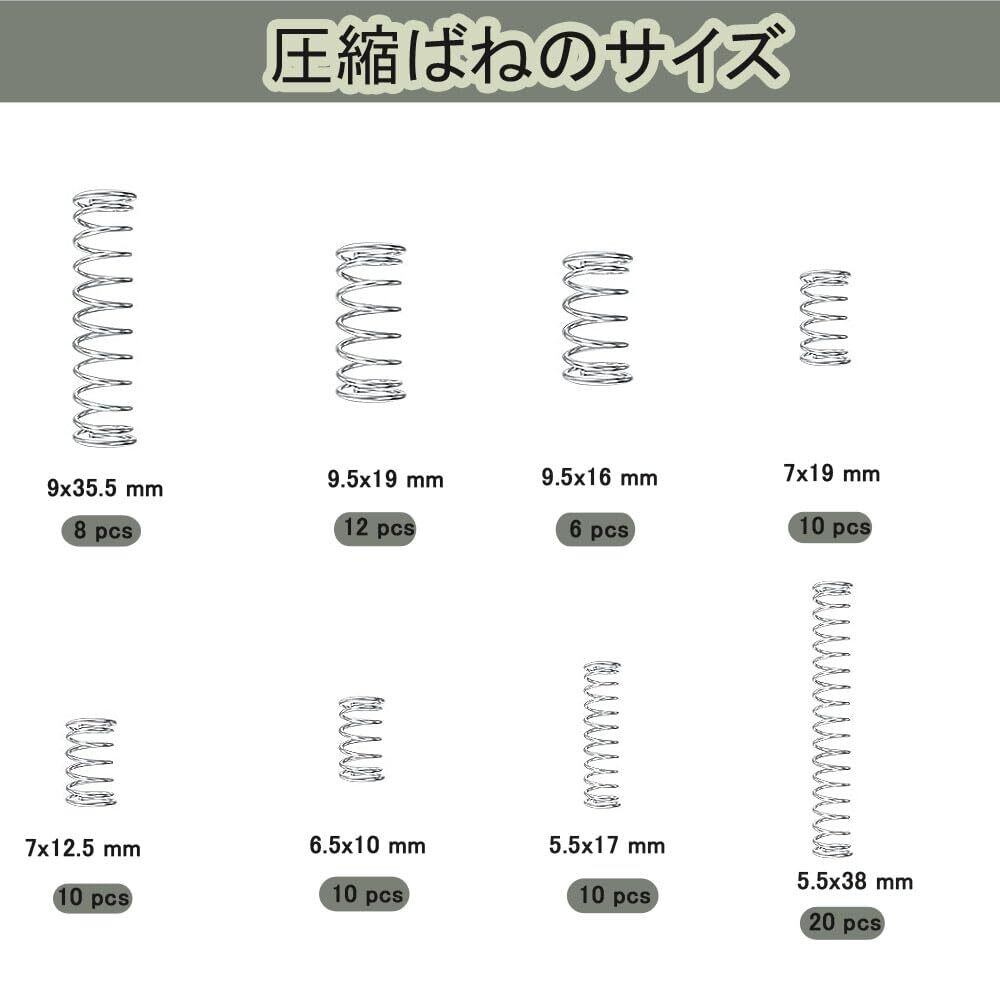 【圧縮ばね】12.7x7.14mm: 10pcs、6.35x10.3mm: 10pcs、 5.55x17.46mm: 10pcs、 9.52x15.8mm: 6pcs、 9.52x19.05mm: 12pcs、 7.93x44.4mm: 12pcs、 9.1x34.9mm: 8pcs、 5.55x38.1mm: 10pcs、 7.14x19.05mm: 10pcs。