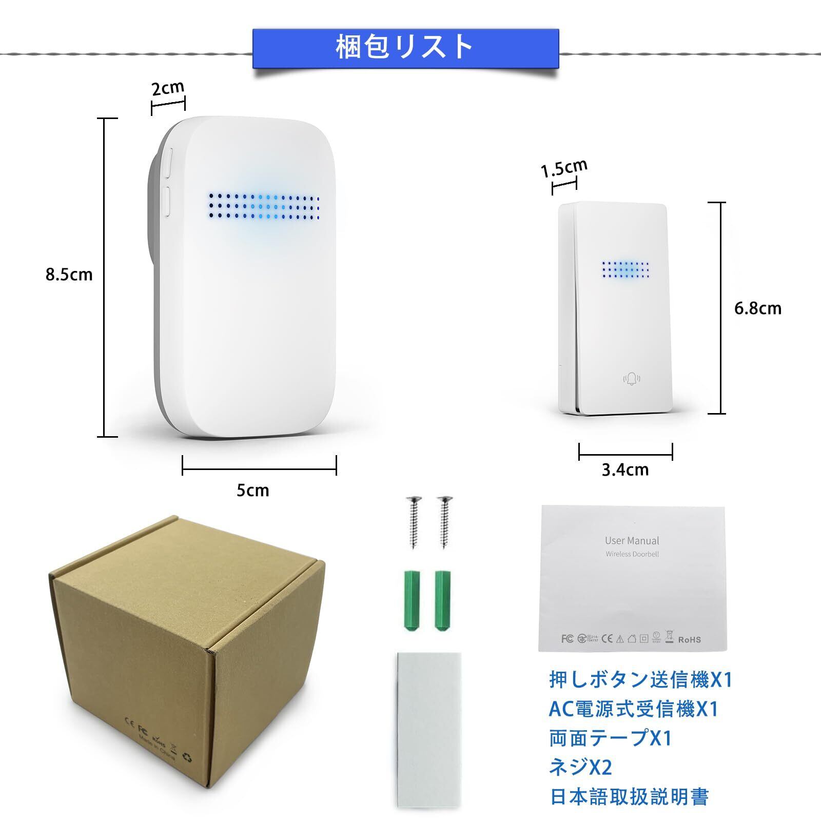 【38曲4段階音量調節と光でお知らせ】このワイヤレスチャイムの送信機を押すと、受信機が音を立てながら両方のライトが点滅してお知らせします。 この玄関チャイムは38種類の音色の曲と0-100DBの4段音量を選ぶことができます。自分の好みや使う場所に合わせて、適切な音量を選ぶことができて、とても便利です。