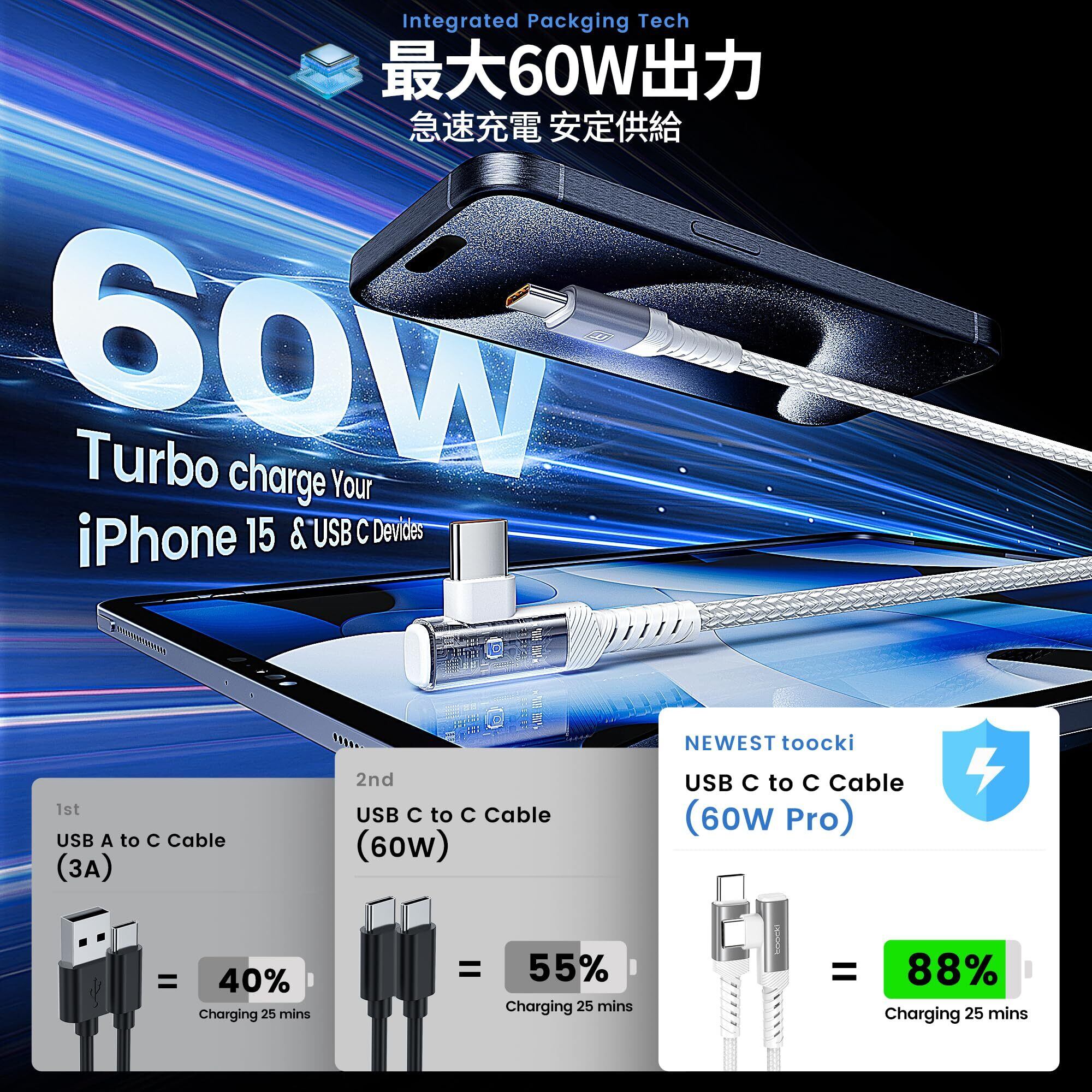 【新春セール】toocki usb c ケーブル L字 【1M+1M】2本セット PD/QC 60W/3A 急速充電 断線防止 ナイロン編み アンドロイド IPhone 16/15/Pro、iPad Pro、Galaxy、Xi.aomi、PixelなどType-c機種に対応(ホワイト)
