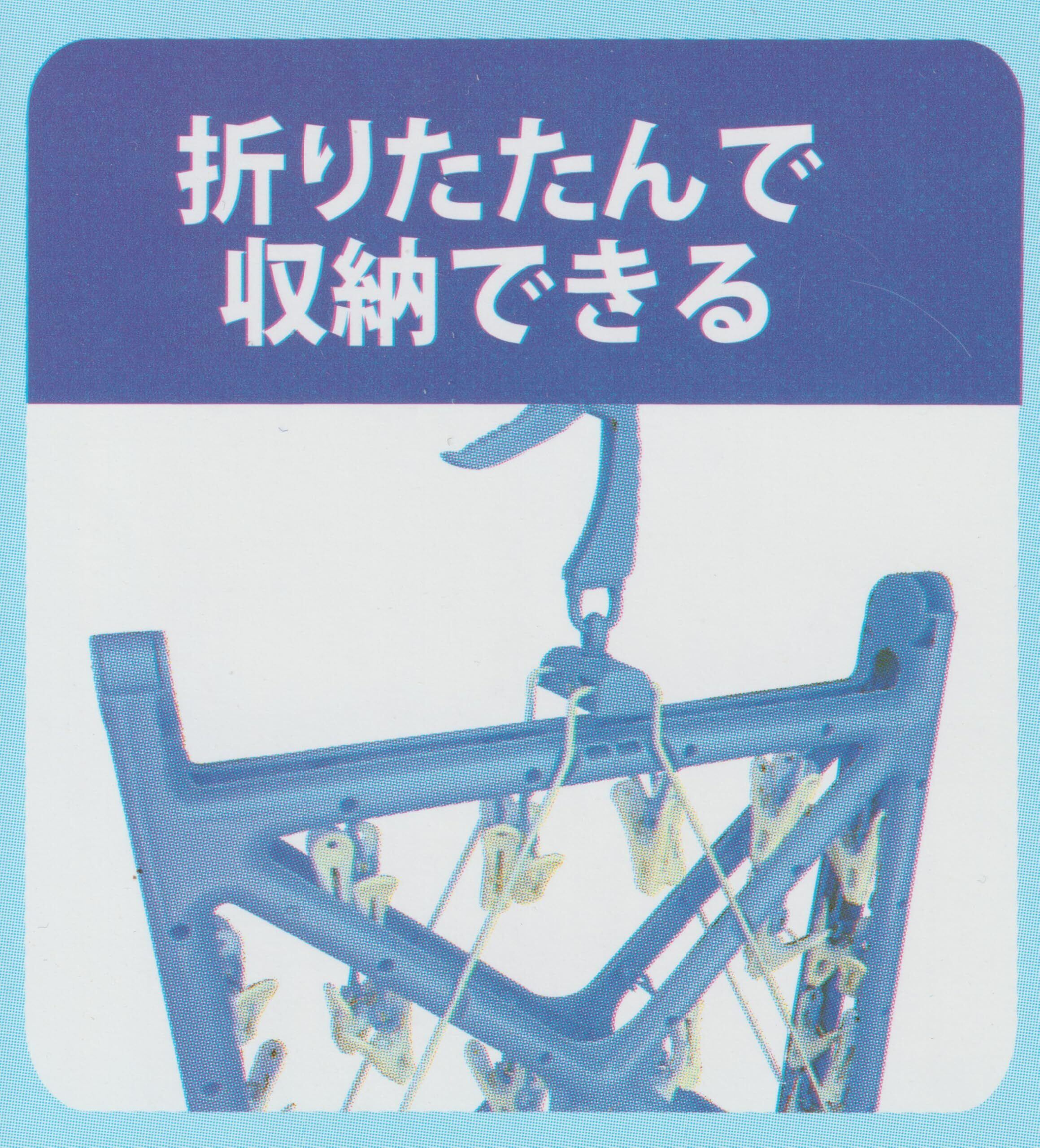 開閉がスムーズなワイヤー吊り下げです。室内干しに便利なフックつきです。吊り下げ部分にワイヤーを採用していますので、開閉がスムーズです ピンチ52個付 室内干しに便利なフック付きです 使用しないときは折りたたんで竿にすっきり掛けられる下折れ式フレーム