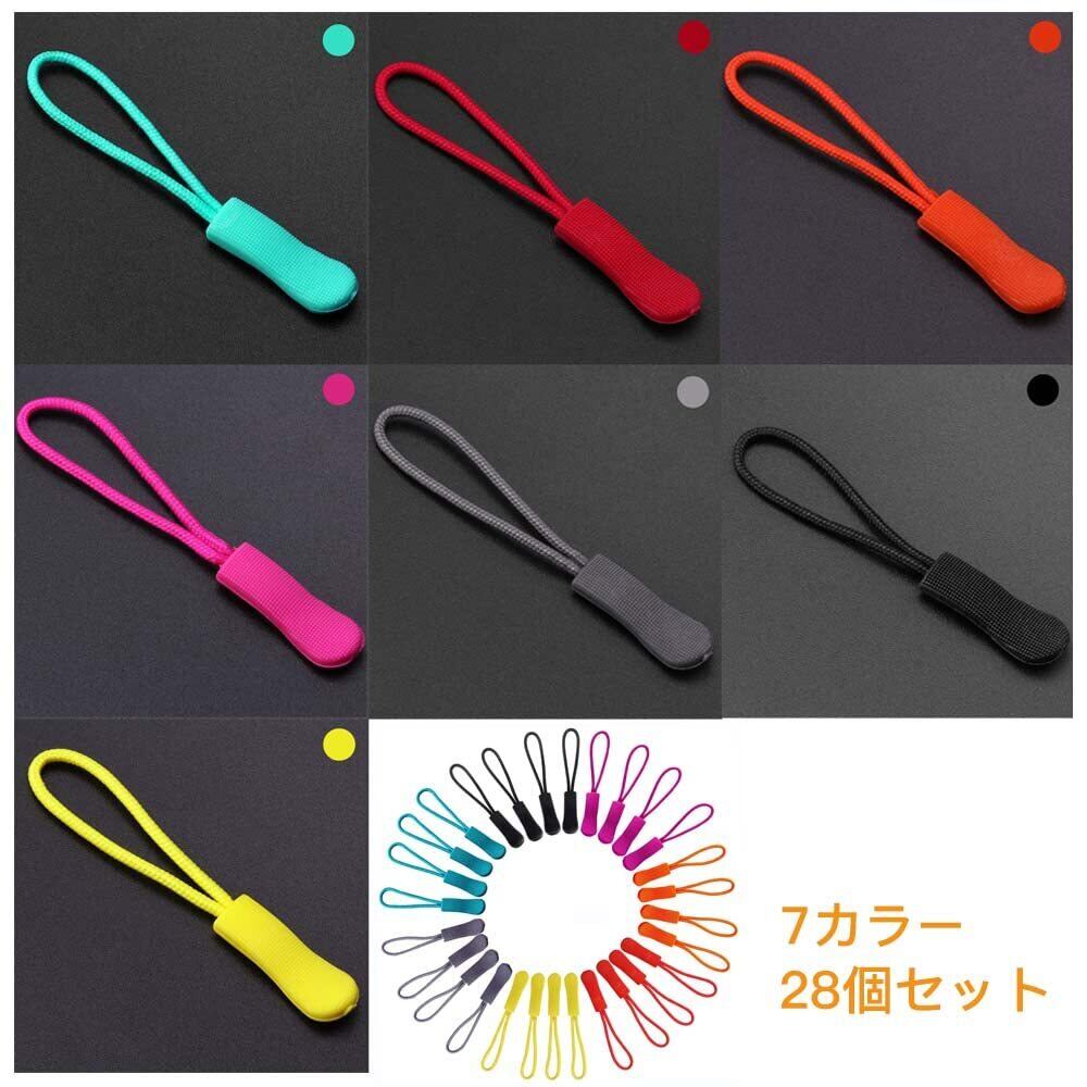 【パッケージ内容】7カラー28個のジッパーの引き手。サイズ:つまみロープ 長さ約66mm 幅約8mm 。(イエロー、ブル—、オレンジ、グレー、ブラック、レッド、ピンク)。