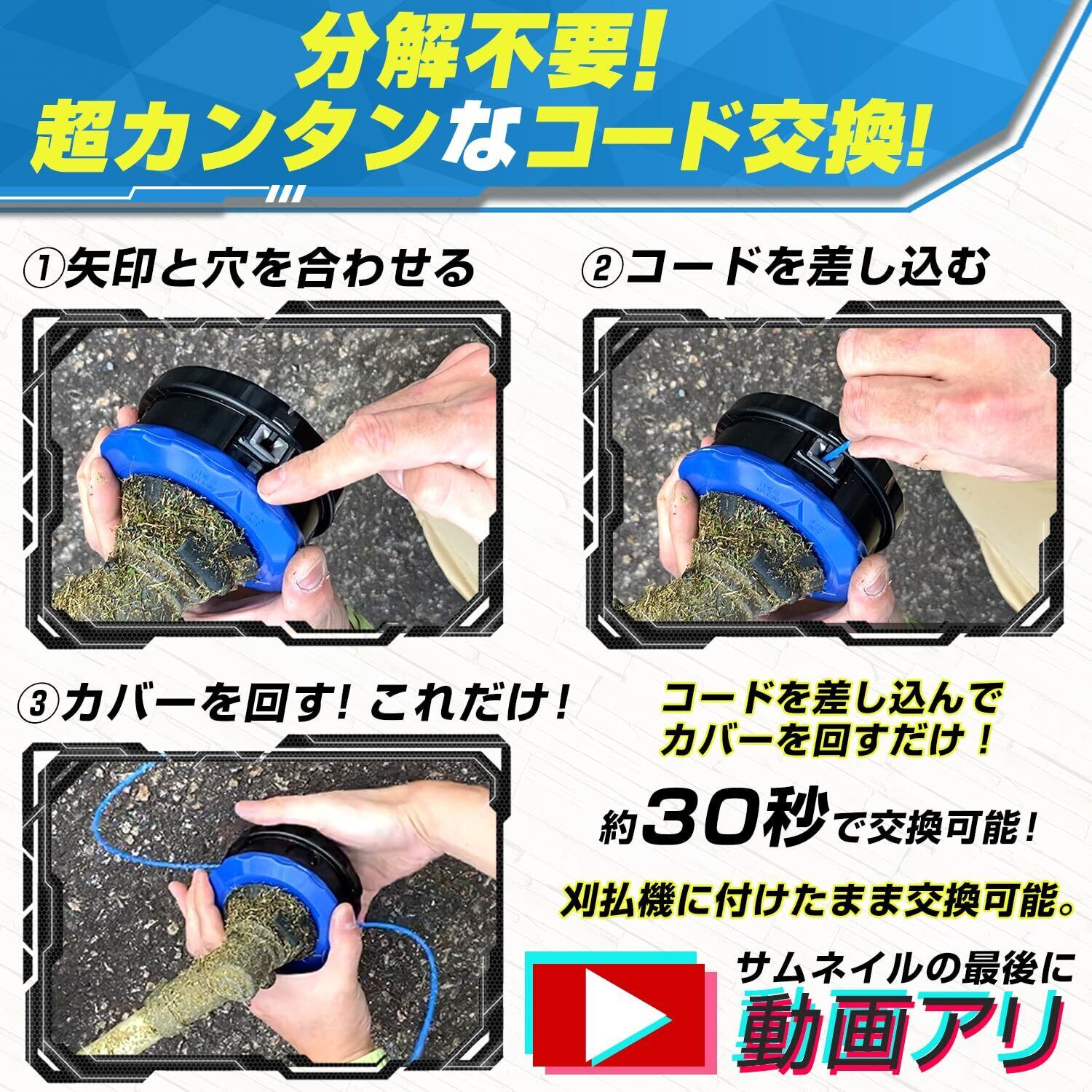 ②カンタンなコード交換:ナイロンコードの交換も超簡単で分解不要!約30秒で交換可能でコードを差し込んで本体を回すだけ!本体からの取り外しはもちろん不要。