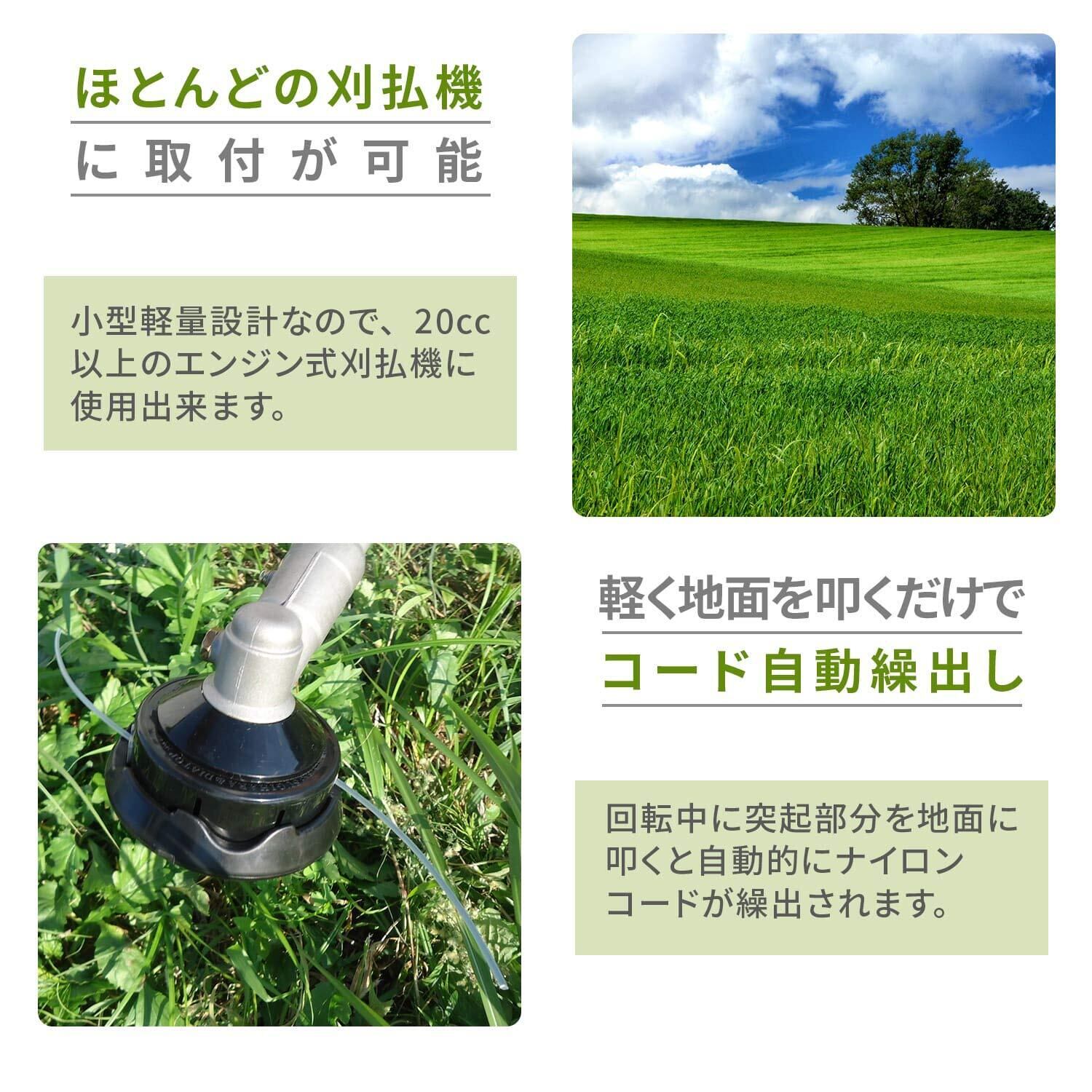【特徴】耐久性の高い日本製原材料ナイロンコード採用したナイロンカッターです。回転中に突起部分を軽く地面に叩くと自動的にナイロンコード繰出します。小型軽量設計なので、20cc以上のエンジン式刈払機に使用することが出来ます。硬いものに当たっても破損の心配がないので、コンクリートやフェンスなどの障害物のある周辺での作業も安心です。コードの先端で効率良く、草刈りが出来ます。
