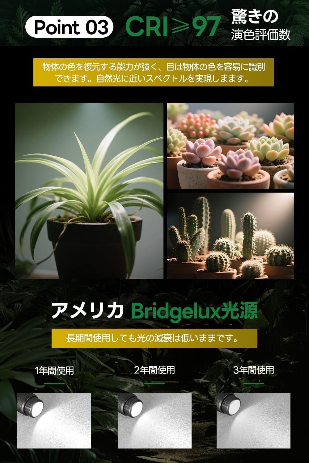 【CRI≥97高演色性】 植物育成ライトの演色性評価数(CRI≥97)で、演色性は太陽光とほぼ同じです。植物育成ライトの照射により、植物の実際の成長は太陽光下での成長状態に近づきます。