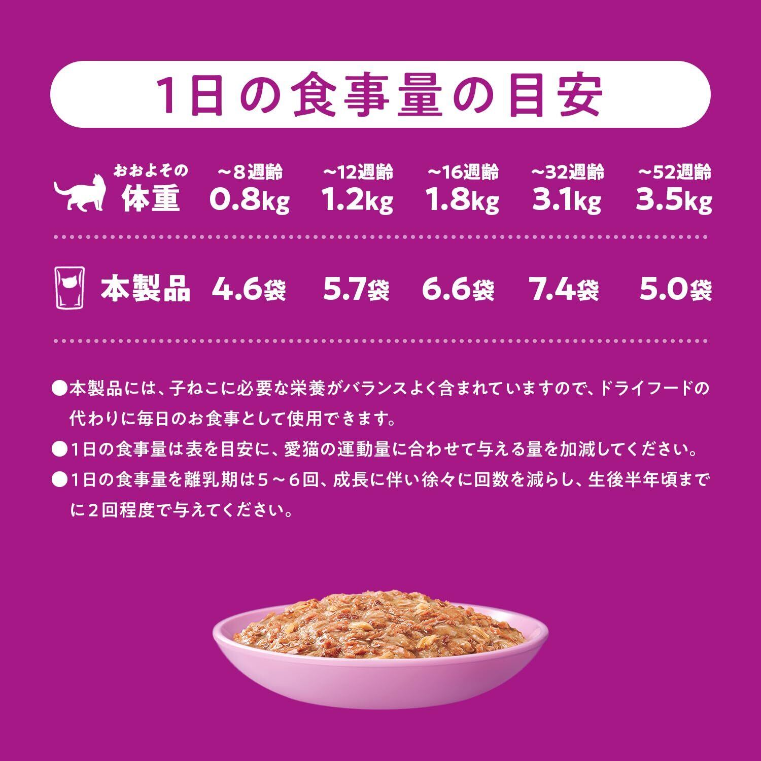 ~8週齢(おおよその体重0.8kg):4.6袋、~12週齢(おおよその体重1.2kg):5.7袋、~16週齢(おおよその体重1.8kg):6.6袋、~32週齢(おおよその体重3.1kg):7.4袋、~52週齢(おおよその体重3.5kg):5.0袋 本製品には、子ねこに必要な栄養がバランスよく含まれていますので、ドライフードの代わりに毎日のお食事として使用できます。1日の食事量は表を目安に、愛猫の運動量に合わせて与える量を加減してください。1日の食事量を離乳期は5~6回、成長に伴い徐々に回数を減らし、生後半年頃までに2回程度で与えてください。常に清潔で新鮮な飲み水をご用意ください。本製品を初めて与えるときは、今までの食事に少量混ぜ、1週間程度で徐々に増量しながら切り替えてください。