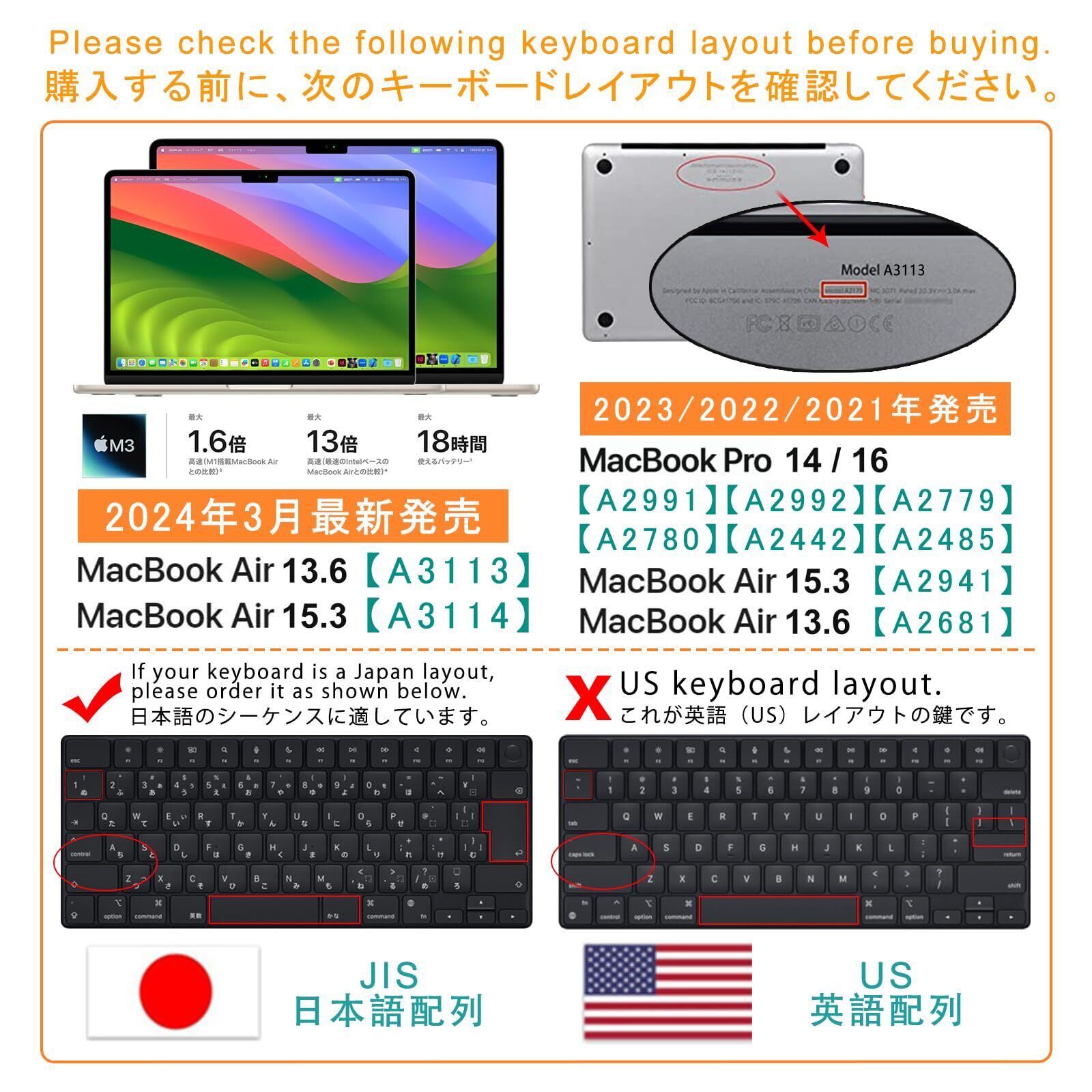 【対応機種】(M4/M3/M2/M1 チップ)Macbook Air 13/15(2025)/Macbook Pro 14/16 (2024)/Macbook Air 13/15(2024)/Macbook Pro 14/16 (2023)/Macbook Air 15(2023)/Macbook Pro 14/16 (2023)/Macbook Air 13(2022)/Macbook Pro 14/16 (2021) 専用 キーボードカバー [日本語JIS配列],型番:A3240/A3241/A3112/A3401/A3403/A3113/A3114/A2991/A2992/A2779/A2780/A2442/A2485/A2941/A2681。ご購入前にパソコンの型番をよく確認してください。