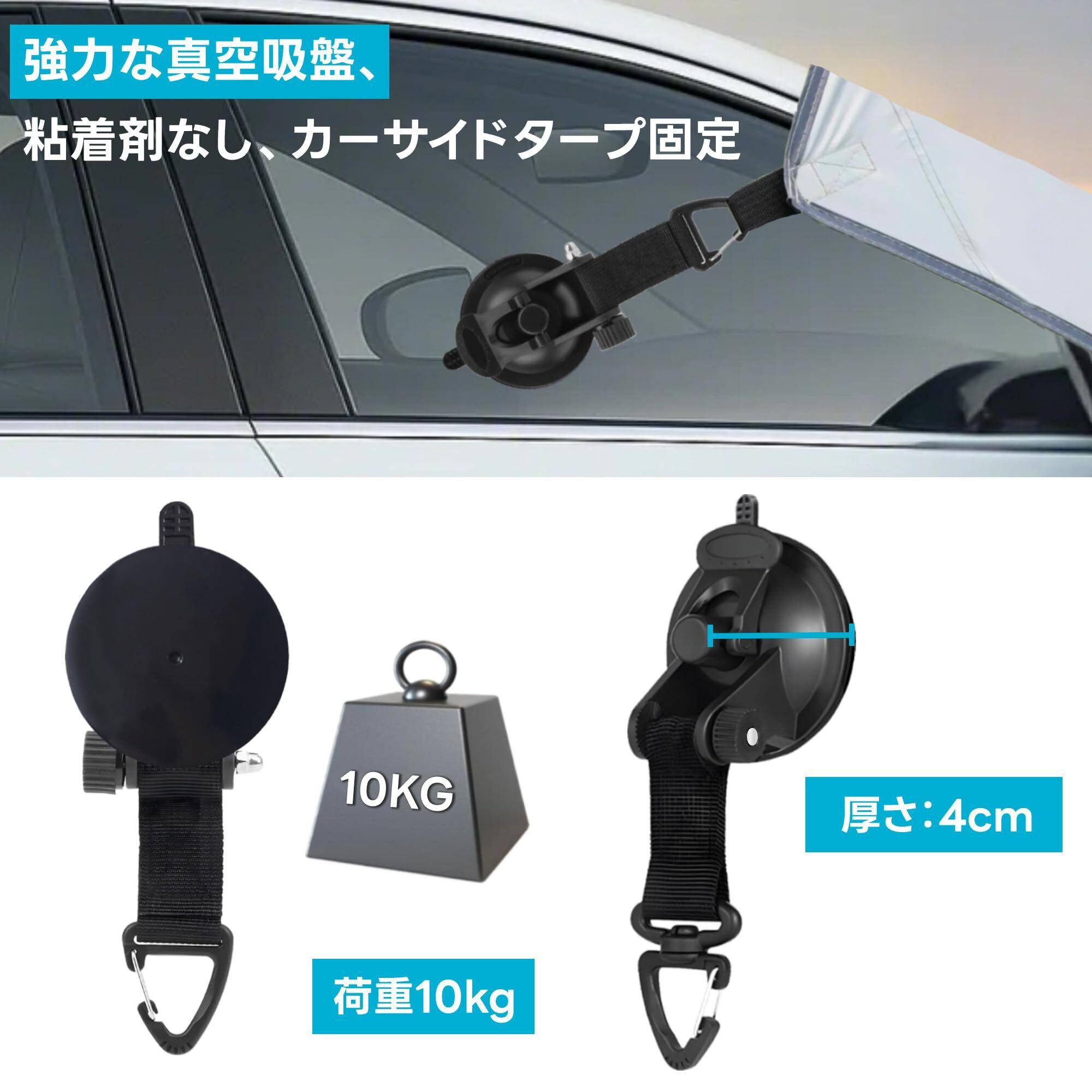 【直径7cm 真空吸盤フックセット】セット内容:吸盤フック4個、S字フック4個、タオル1枚。吸盤素材:TPU+ABS・サイズ:直径7cm*厚さ4cm・耐荷重:静止状態で10kg。使用前に付属のタオルでガラスを拭くことができます。車のサイドテントやサンシェードの固定に使う場合は取付穴の種類によってS字フックを選択することができます。