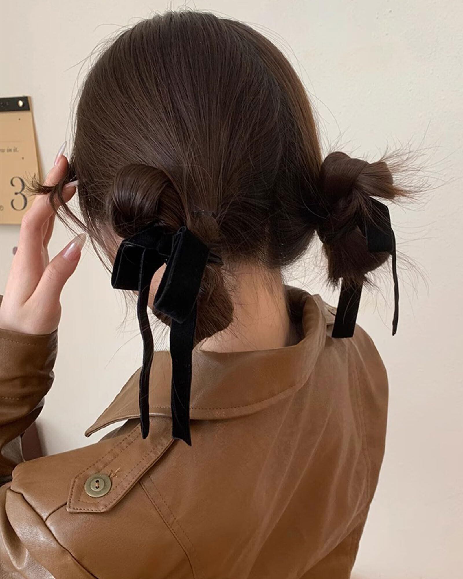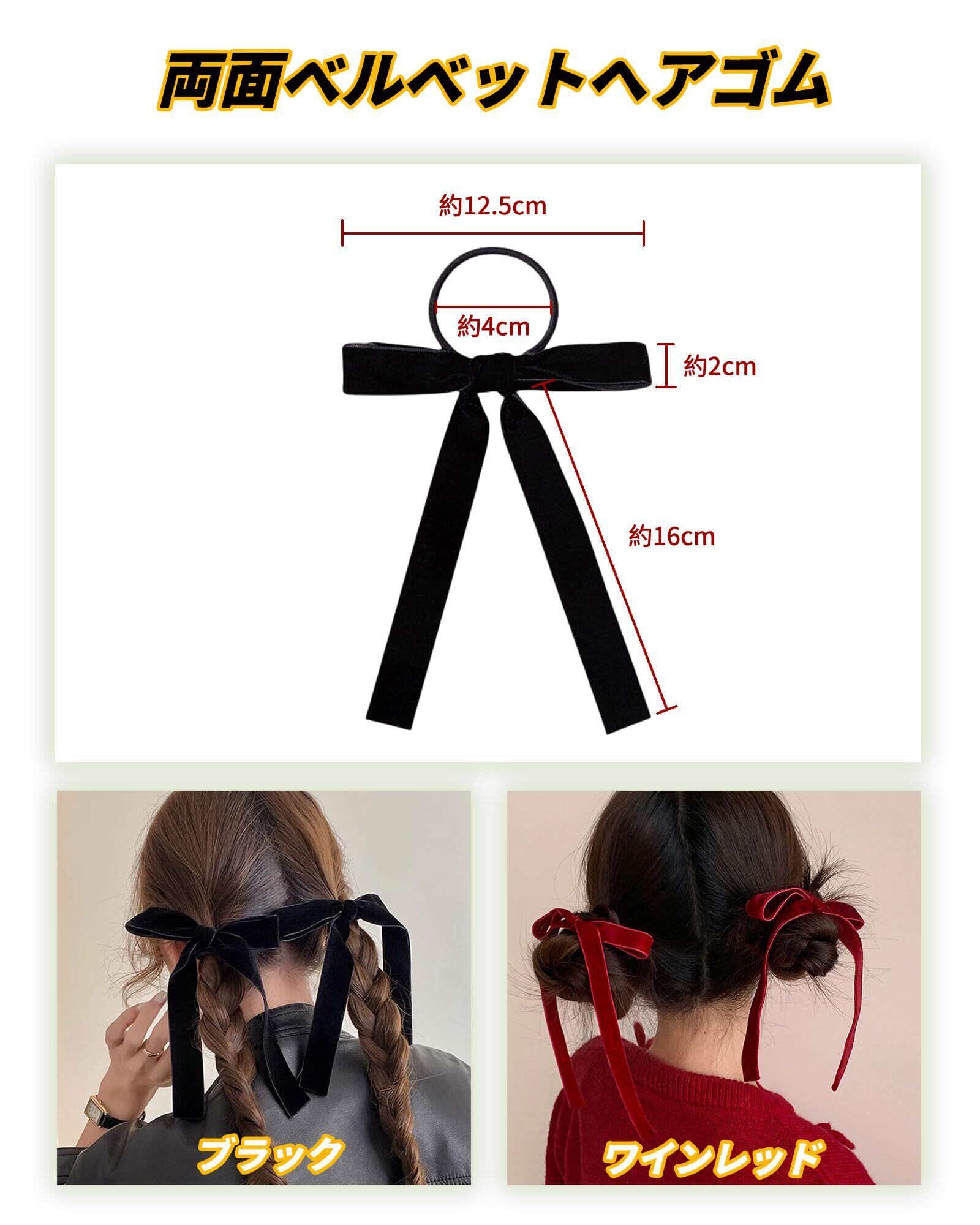 Sheepyo ベロア リボン ヘアゴム 2個セット 黒 ヘアアクセ ベルベット シュシュ ヘアアクセサリー 髪飾り リボン 結婚式 おしゃれ 髪ゴム 大人 成人式 ブラック (ブラック 2枚セット)