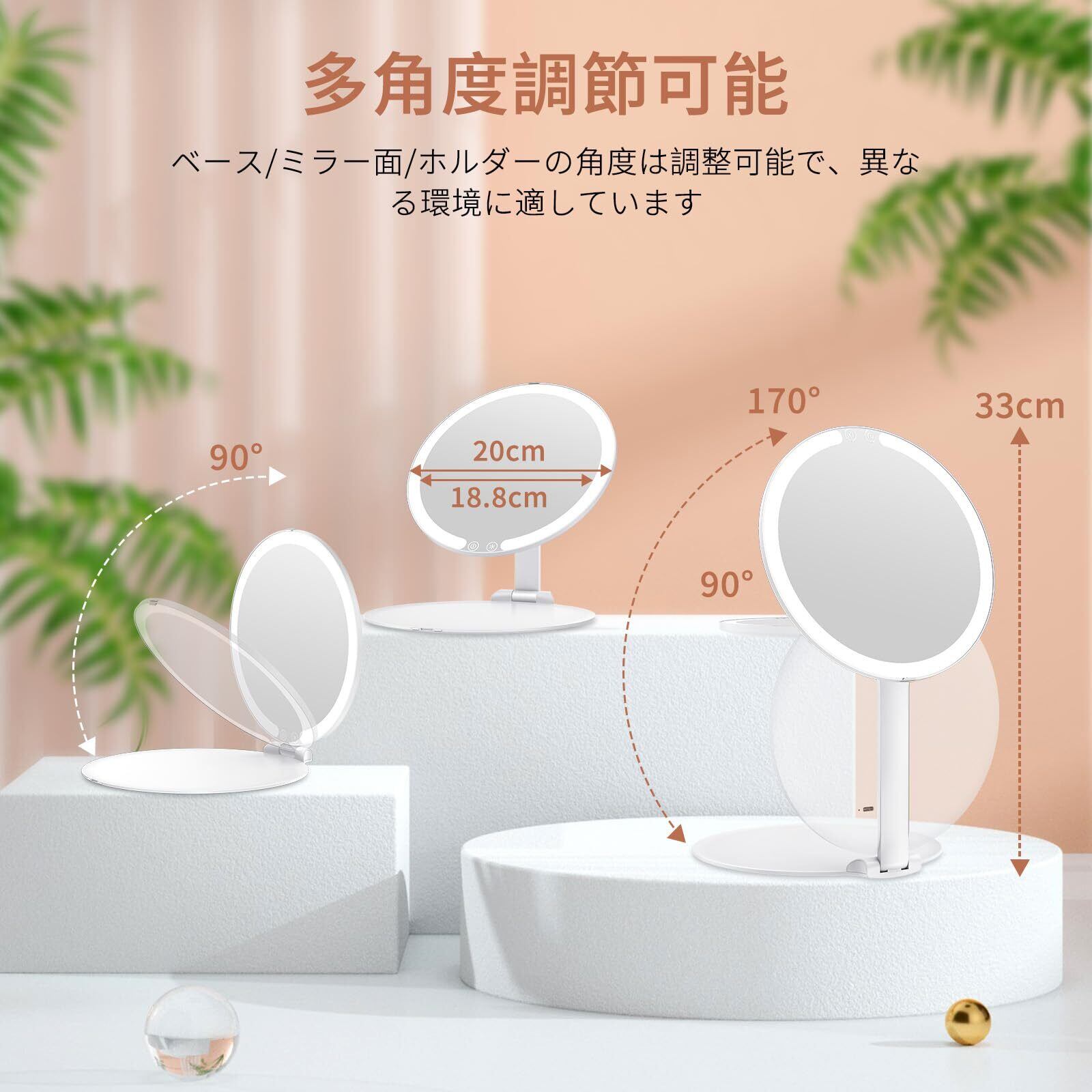 【角度調節可能&大きいサイズ】milproxの化粧鏡は、ベース、ミラー面、スタンドの角度を自由に調節することができ、立てることも折りたたむこともできます。さまざまな高さ、角度、シーンに対応することができます。直径は20cmで、折りたたんで収納することができます。USB-C充電式で、バッテリー容量は1500mAhあり、充電一回で3-5時間使用できます。非常に便利で使いやすく、旅行や家庭、オフィスなど、あらゆる場面で簡単に使用することができます。