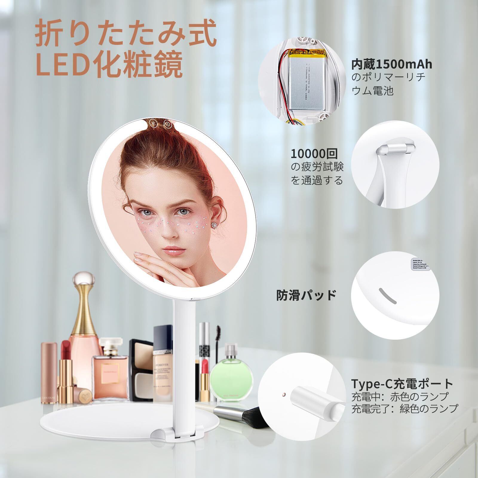 【新春セール】MILPROX 女優ミラー ライト付き 化粧鏡 折りたたみ USB-C充電式 20cm 寒暖自然色調節 明るさ調節 角度調節 卓上ミラー 旅行用 持ち運びに便利