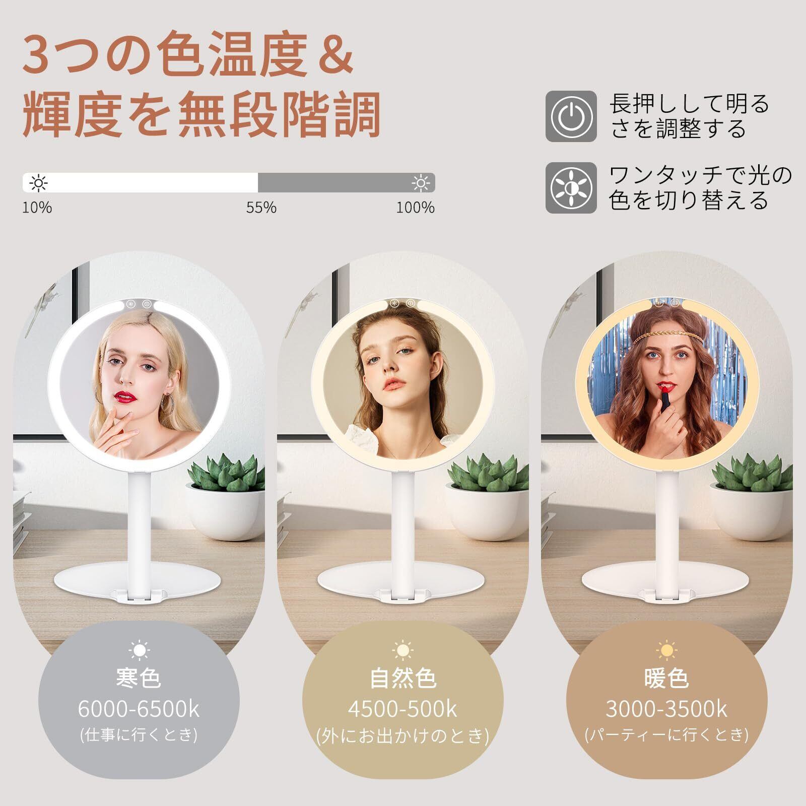 【3色の光+無段階調光】ワンタッチで「寒色」「自然色」「暖色」3色が替えられます。様々な照明条件で完璧なメイクを簡単に完成させることができます。明るい昼間、柔らかい夕暮れ、暗い夜など、シーンに応じて簡単に切り替えて、最適な光を手軽に取得できます。更に、無段階調光機能をサポートしており、長押しで明るさを自由に調整することができます。どのような状況でも、最適な光量でメイクを仕上げることができます。初心者から上級者まで、どんな場面でも完璧なメイクを実現することができる化粧鏡です。