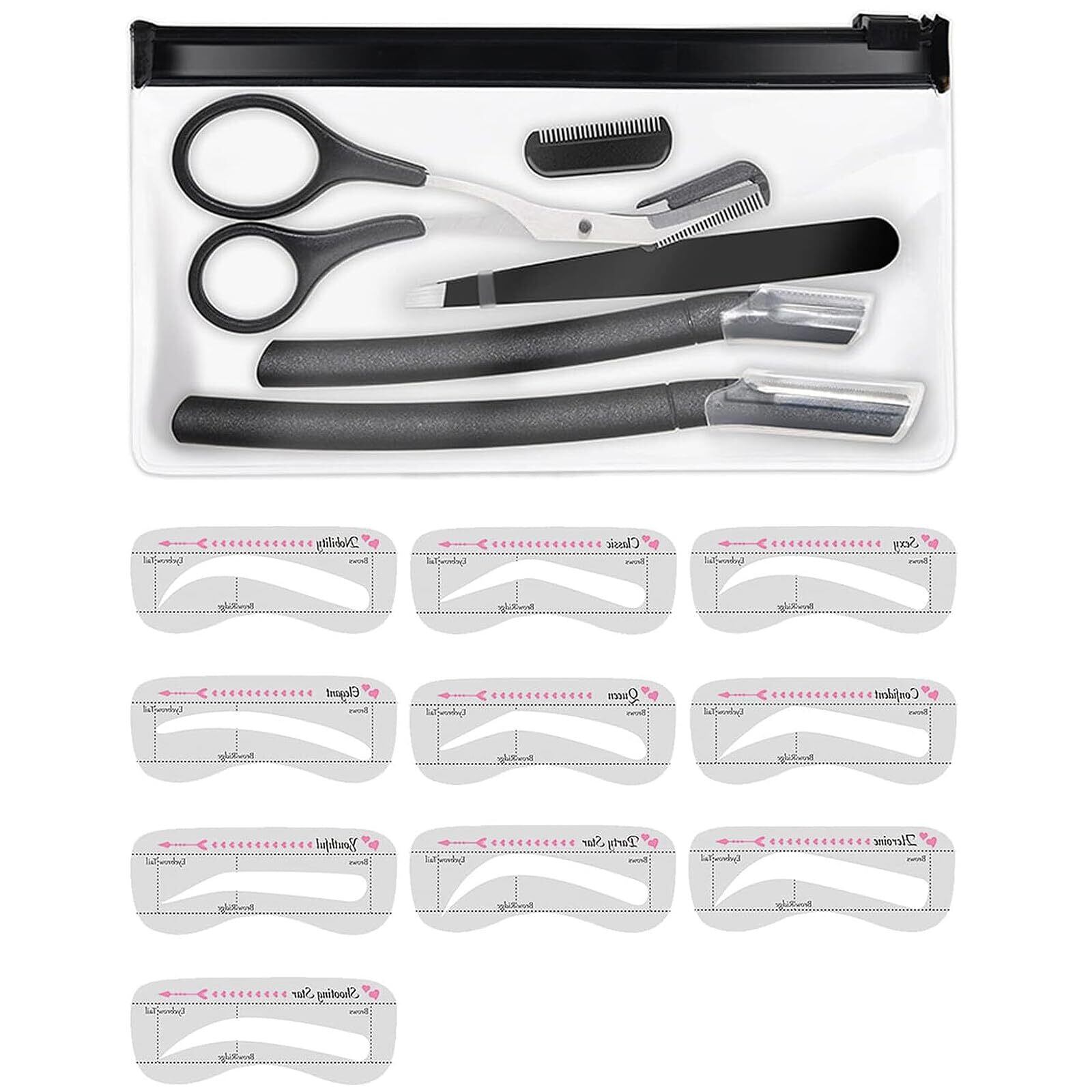 セット内容:毛抜き、コーム付きまゆげ用ハサミ、ガード付きカミソリ(小)、ガード付きカミソリ(大)、まゆ毛用テンプレート(10種類)、収納袋付き。