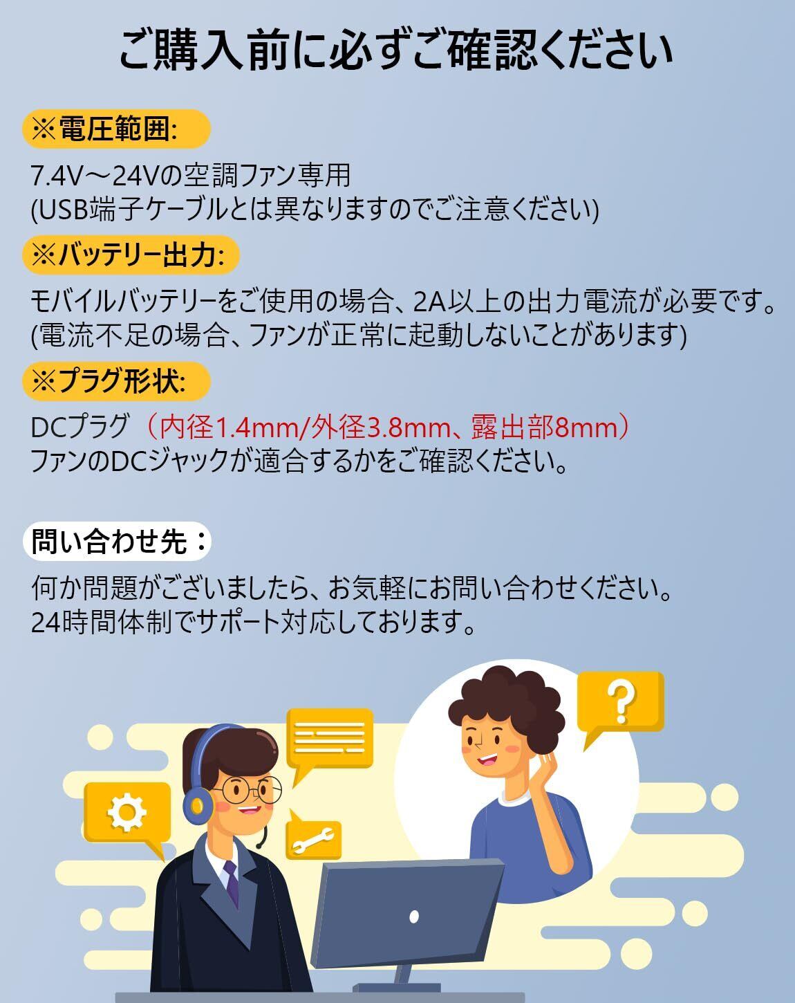 【使い方は簡単】作業用ファン専用DC to DCケーブルです。2つの黒いDC端子をファンに接続、もう一方がDC端子がバッテリーに接続されています。(バッテリー・電池ユニットは付きません)ファン取付口径は9cmで、市販のほとんどの作業服冷却服ファンに取って代わることができ、互換性が非常に高いです。購入前にお手持ちのファンとバッテリーの仕様をご確認ください。ご不明な点がございましたらお気軽にお問い合わせください。