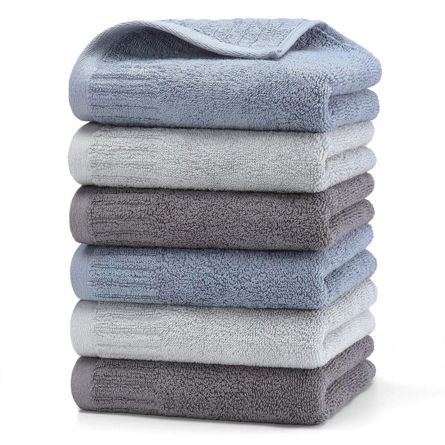 【フェイスタオル 6枚セット】素材:綿100% 、サイズ:約35x71cm 、重量:1枚あたり 約100g 、セット内容:ライトグレー2枚+ダークグレー2枚+ブルー2枚。※洗濯機の注意:パイル抜けや毛羽落ちを防ぐには、洗濯機て洗うことをおすすめしません。※綿製品だからタオルの表面に毛羽が付く場合がありまして、初回洗濯時多少毛羽落ちますので、単独でのお洗濯をおすすめします。漂白剤無し、30度以下の水温で2~3回単独洗いをオススメしております。