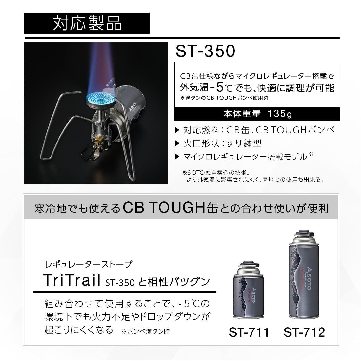 【雪山・寒冷地対応】寒冷地でも使用可能なハイパワーなCB缶です。TrekMaster(トレックマスター)ST-331、TriTrail(トライトレイル)ST-350と組み合わせることで、-5℃の環境下でも火力不足やドロップダウンが起こりにくくなります(※ボンベ満タン時)