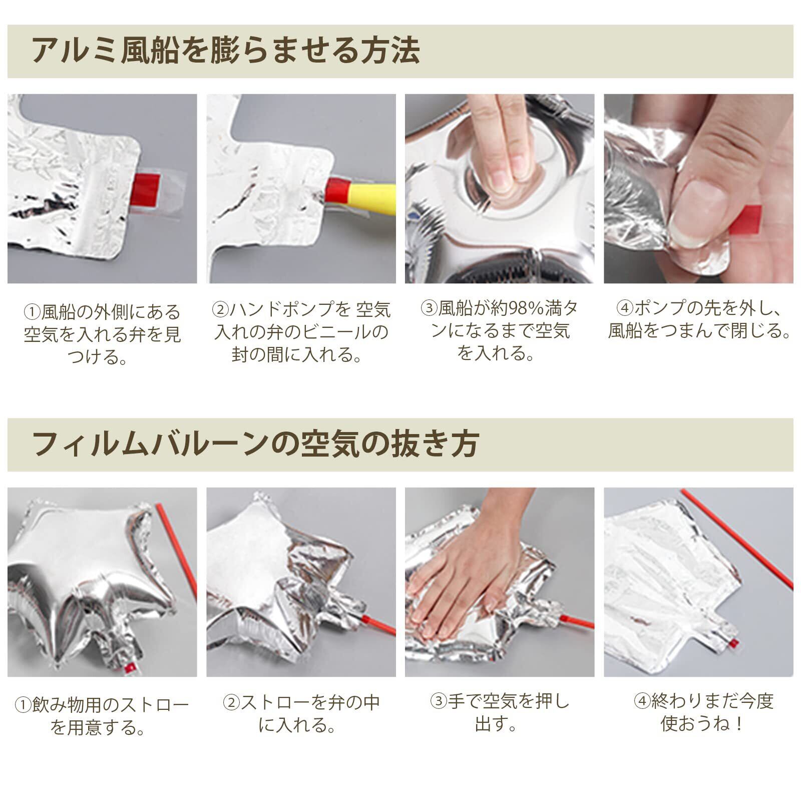 〔アルミ風船について〕アルミ風船を膨らませる方法:①風船の外側にある空気入れ弁を見つけます。②ハンドポンプを空気入れの弁のビニールの封の間に入れます。③風船が約98%満タンになるまで空気を入れます。④ポンプの先を外し、風船をつまんで閉じます。空気入れ弁にストロー等を差し込み、圧をかける事で空気を抜く事が出来ます。パーティー終わたら、ちゃんと収納して、次のパーティーやお部屋の飾り付けとして再利用も可能です。