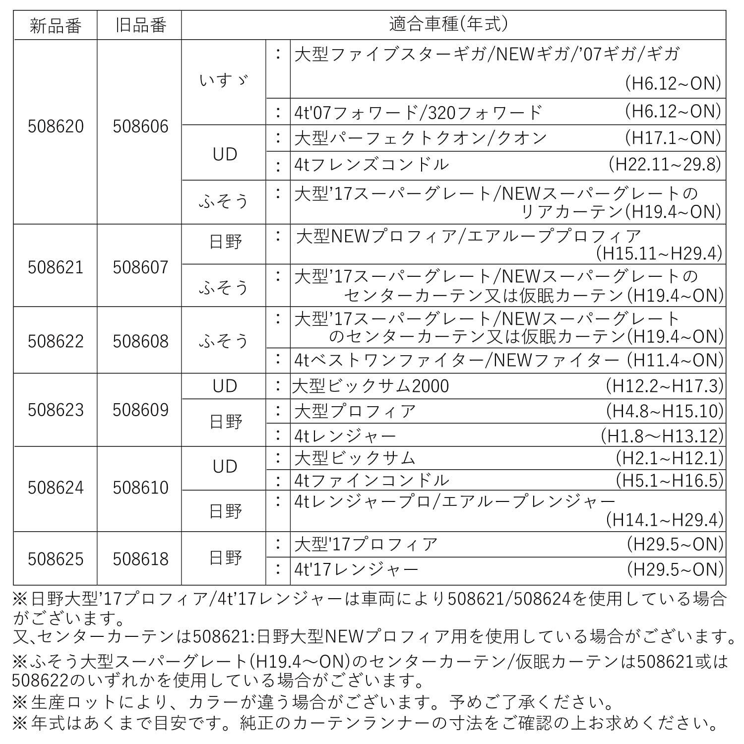 適合車種:いすゞ大型ファイブスターギガ/ギガ(H6.12~ON)/4t ’07フォワード/320フォワード(H6.12~ON)、UD大型パーフェクトクオン/クオン(H17.1~ON)/4tフレンズコンドル(H22.11~H29.8)、ふそう大型’17スーパーグレート/NEWスーパーグレートのリアカーテン(H19.4~ON)