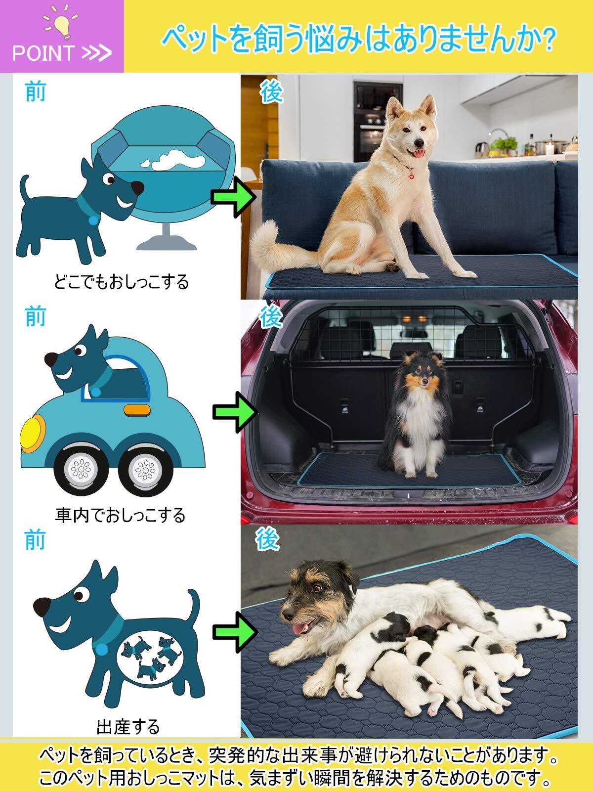 【幅広い適用性】このペット用おしっこマットは中型・大型犬、猫、うさぎ、モルモットなどの動物に適用しています。特に妊娠中や授乳中のペット、または失禁、糖尿病などの病気になる、介護必要があるペットに最適!床だけではなく、ソファ、ペットトイレ、ペットベッド、ケンネル、ペットキャリーバッグ、ペットサークルやペットケージにも使え、そして、お出かけや旅行する時に車内で敷けば安心にご利用いただけます。このペット用おしっこマットはペットトイレまたはペットベッドの下に使用することは一番お勧めします。